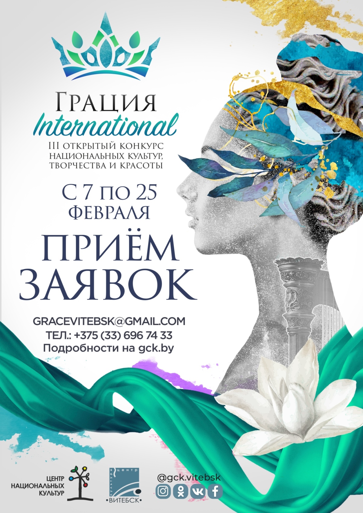 Государственное учреждение «ЦЕНТР КУЛЬТУРЫ «ВИТЕБСК» и Центр национальных культур осуществляет до 25 февраля 2022 года приём заявок на участие в III Открытом конкурсе национальных культур, творчества и красоты «ГРАЦИЯ INTERNATIONAL» в г.Витебске. К участию приглашаются девушки в возрасте от 18 лет до 31 года, которые учатся в высших учебных заведениях Республики Беларусь. Более подробно ознакомиться с информацией о конкурсе можно здесь ( www.gck.by).