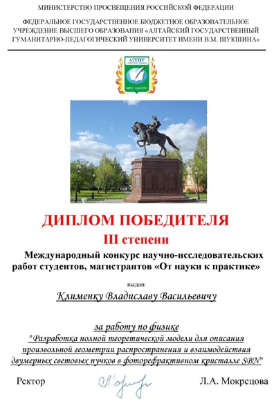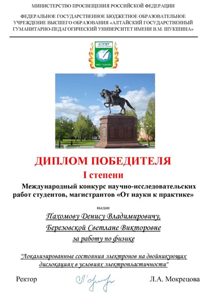 По направлению «Физика» научно-исследовательские работы студентов физико-инженерного факультета отмечены сразу дипломами I и III степени: диплом I степени – Пахомов Д.В. (4 к., 2 гр.), Березовская С.В. (4 к., 1 гр.) НИР «Локализированные состояния электронов на двойникующих дислокациях в условиях электропластичности» (научн. рук. Савенко В.С., заведующий кафедрой физики и математики, доктор технических наук, профессор), диплом III степени – Клименок В. В. (3 к., 3 гр.) НИР «Разработка полной теоретической модели для описания произвольной геометрии распространения и взаимодействия двумерных световых пучков в фоторефрактивном кристалле SBN» (научн. рук. Давыдовская В.В., доцент кафедры теоретической физики и прикладной информатики, канд. физ.-мат. наук, доцент).