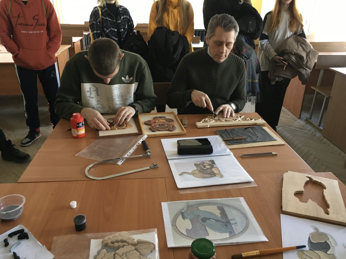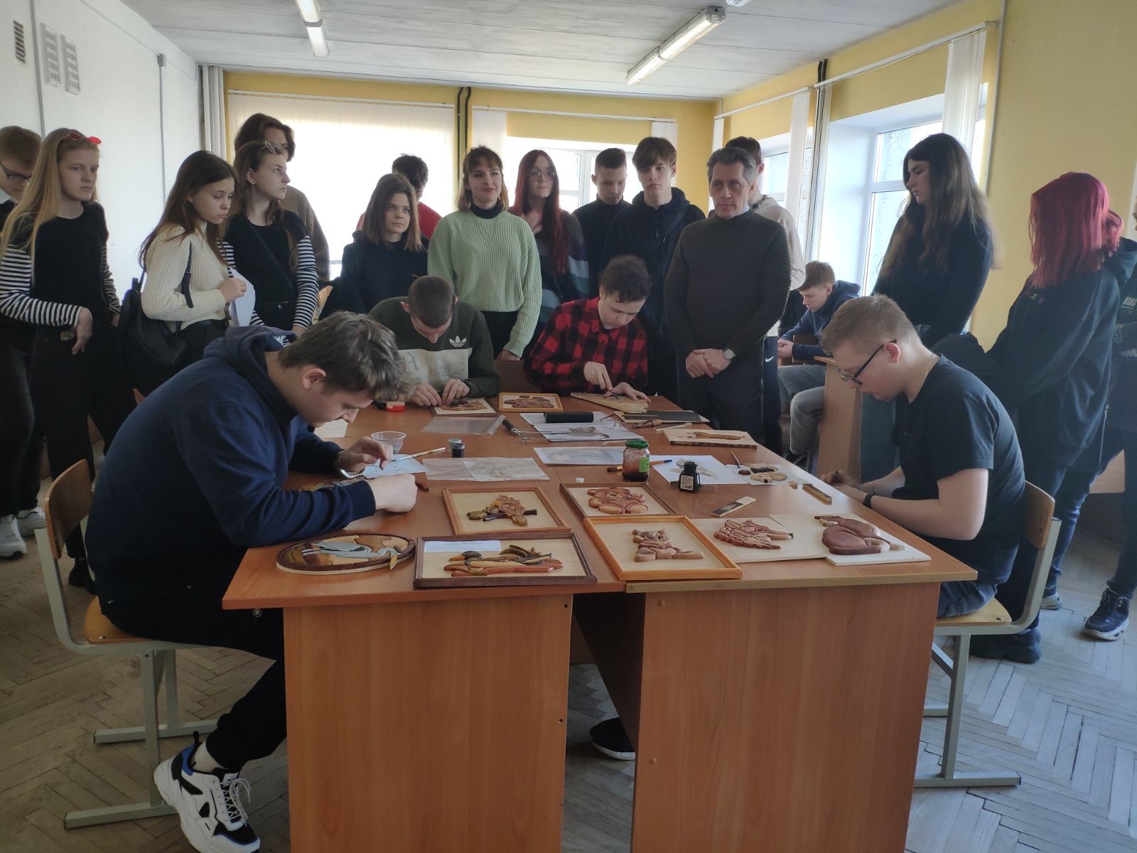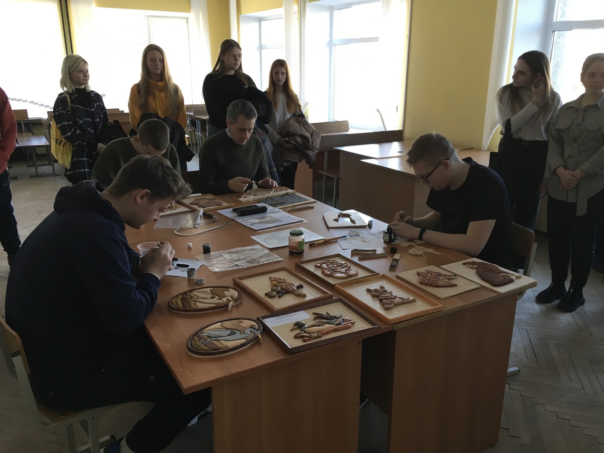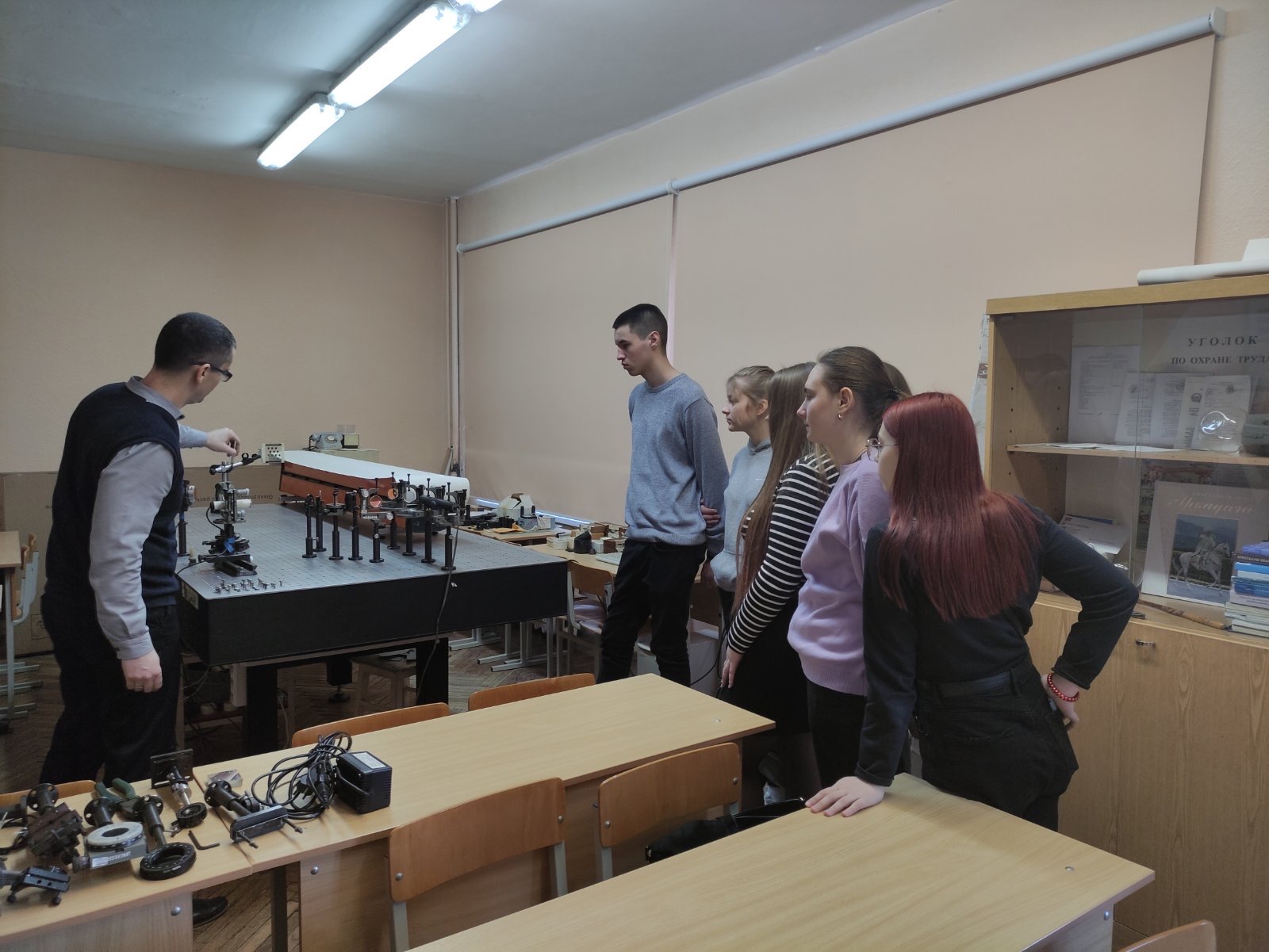 Вторая часть профориентационной встречи носила практико-ориентированный характер. Учащиеся посетили мастер-класс по художественной обработке древесины (руководитель старший преподаватель кафедры инженерно-педагогического образования Лешкевич М.Л.), посмотрели занимательные демонстрационные опыты по физике (руководитель доцент кафедры физики и математики Николаенко Т.В.), познакомились с лабораторией когерентной оптики и голографии (выставку голограмм продемонстрировал доцент кафедры теоретической физики и прикладной информатики Макаревич А.В.).