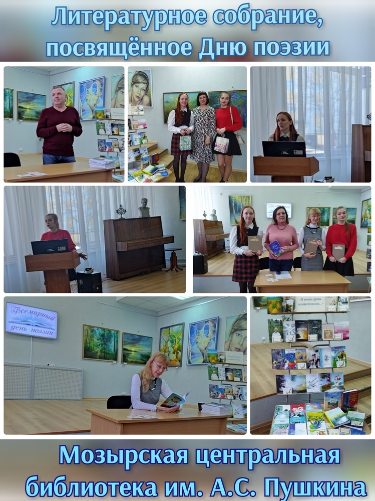 23.03.2022 студенты филологического факультета Стрельцова Оля и Савицкая Аня (2 к., 1 гр., спец. «Русский язык и литература. Иностранный язык (английский)») приняли участие в литературном собрании, посвященном Дню поэзии. Творческая встреча талантливых школьников с маститыми и начинающими поэтами Мозырщины состоялась на базе Мозырской центральной библиотеки имени А.С. Пушкина.