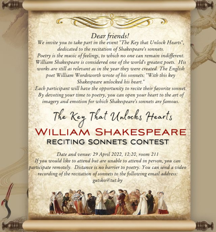 Приглашаем вас принять участие в мероприятии «Ключ, открывающий сердца», посвящённом декламации сонетов Шекспира.