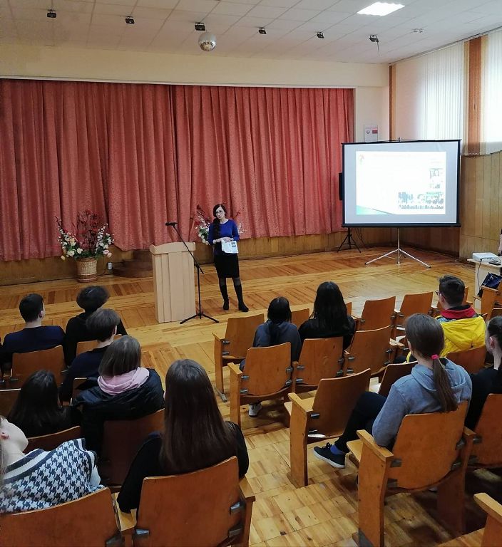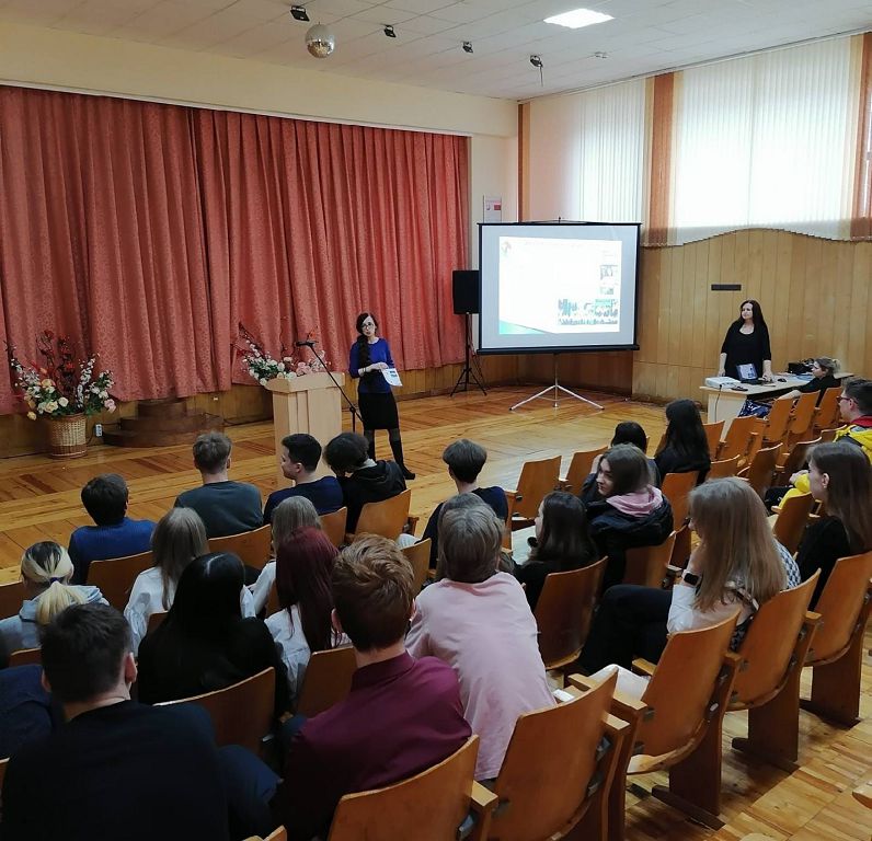 Студентка Алина Инковцова поделилась с учениками секретами успешной учёбы на филологическом факультете, рассказала о насыщенной студенческой жизни, о возможностях активного участия студентов филологического факультета в научно-исследовательских и творческих конкурсах и проектах, таких, как: Международная студенческая научно-практическая конференция «От идеи – к инновации», конкурсы «Студент года», «Мисс университет» и др.