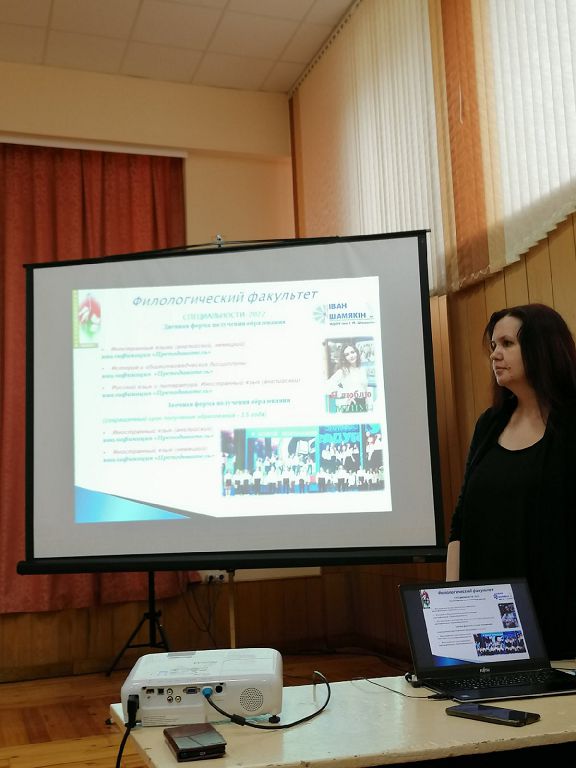 Беседа сопровождалась презентацией, содержащей информацию о специальностях филологического факультета, приоритетности выбора филологического образования и разнообразных мероприятиях научного и воспитательного характера. Учащиеся были ознакомлены с условиями поступления в УО МГПУ им. И.П. Шамякина: вступительными испытаниями, проходными баллами, формами обучения. Особое внимание уделялось специальности «Русский язык и литература. Иностранный язык (английский)», подчеркивалась её перспективность и актуальность для молодежи XXI века.