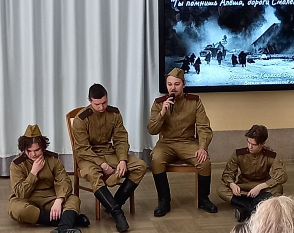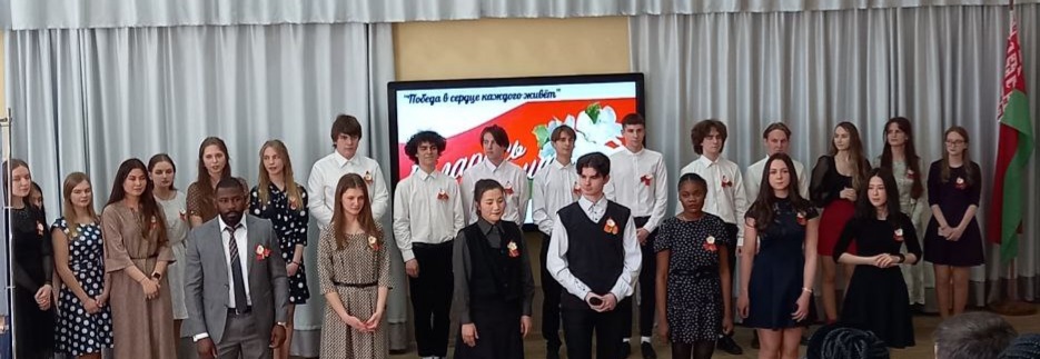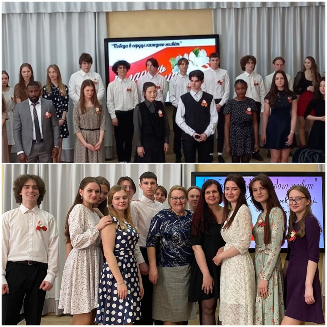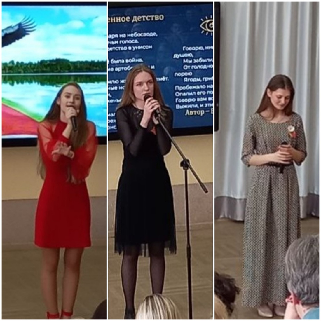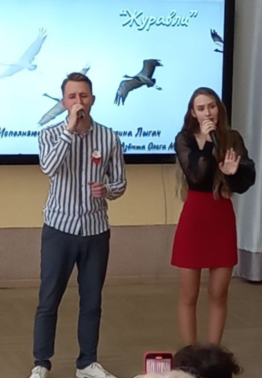 В концерте звучали песни военных лет в исполнении студентов нашего университета: проникновенная баллада Карабинович К., авторское акапельное выступление Соколовой А. (посвященное бабушке-ветерану ВОв, автору военной лирики, процитированной внучкой), вальс Инковцовой А. в сопровождении хореографической постановки (Новиков Н., Струк М., Блохин Н., Бородавко К., Головин Я., Ефименко Е., Редькова А., Шевель А., Шевчук К., Шоба Е., Дулева А., Пилипенко А., Расулова Л., Козлов Д., Потапенко Р., Королёнок И., Шецко А.), а также трогательное выступление ученицы Мозырского государственного лицея Лыгач Э. сольно и в дуэте с выпускником нашего вуза, а ныне учителем английского языка Мозырского государственного лицея Ковалёвым Я. под аккомпанемент преподавателя ЦК «Инструментальное исполнительство. Специальное фортепиано» Мозырского государственного музыкального колледжа Азёмша О. М.