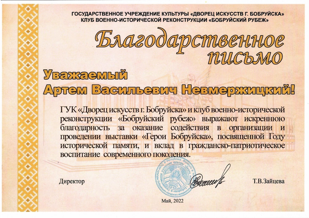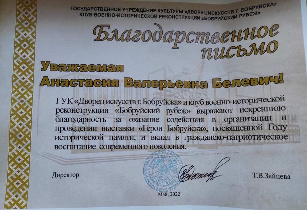 Члены ВИК «Доблесть» Белевич Анастасия и Невмержицкий Артем за участие в организации и подготовки выставки «Герои Бобруйска», посвящённой 77-летию Победы в Великой Отечественной войне, за вклад в гражданско-патриотическое воспитание учащейся молодежи были награждены благодарственными письмами дирекции ГУК «Дворец искусств» г. Бобруйска.