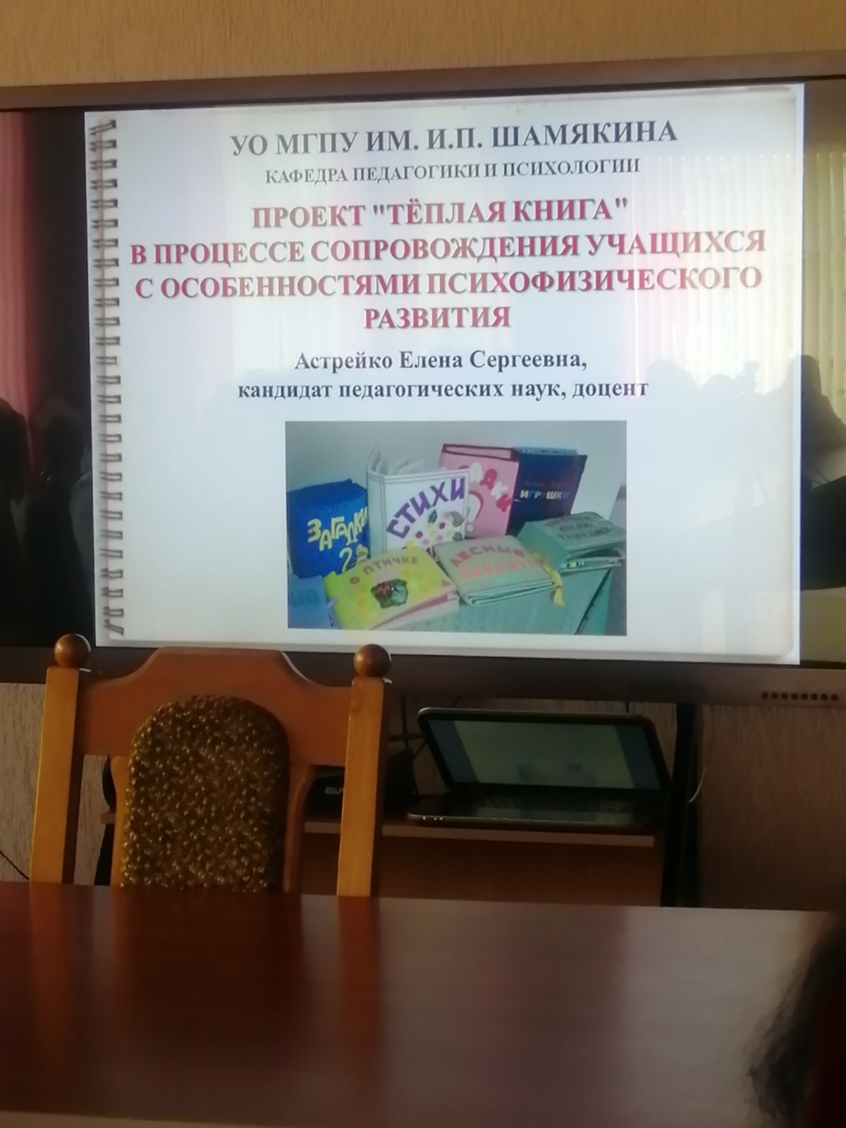 О содержании проекта «Теплая книга» для незрячих и слабовидящих подростков рассказала на научно-практическом семинаре «Педагогическое взаимодействие с дезадаптированными подростками с особенностями психофизического развития: деонтологический аспект» доцент кафедры педагогики и психологии, кандидат педагогических наук, доцент Астрейко Елена Сергеевна. Она представила присутствующим разнообразные по форме, величине книги из ткани и фетра, рассказала об этапах их изготовления, обратив внимание на соблюдение техники безопасности при работе над ними и важности безопасного использования «теплых книг» учащимися с нарушениями зрения.