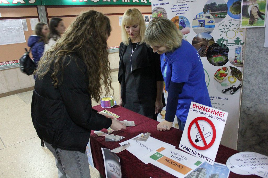 В рамках недели прошла акция «Мы не курим – присоединяйся!». Акция проводилась совместно с УЗ «Мозырский зональный центр гигиены и эпидемиологии» в рамках проекта «Мой стиль жизни сегодня – моё здоровье и успех завтра!». В ходе акции раздавался информационный печатный материал о вреде курения, также все желающие могла проверить свои лёгкие.