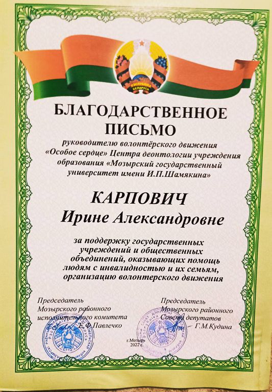 От имени Мозырского районного исполнительного комитета за организацию активной волонтерской деятельности руководитель Центра педагогической деонтологии Карпович Ирина Александровна была награждена грамотой.