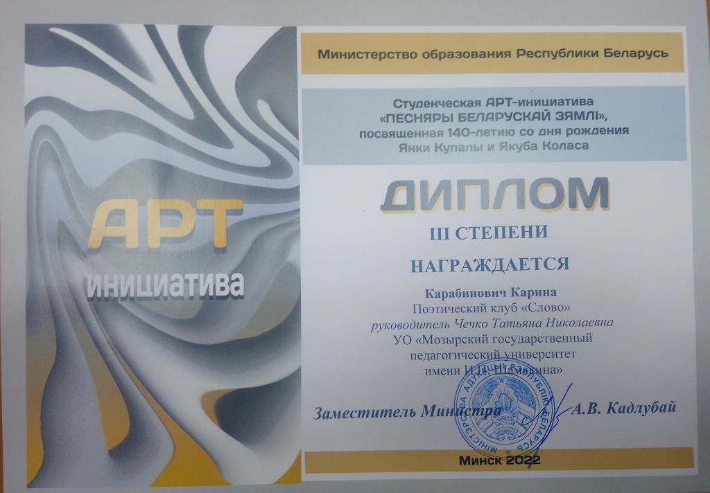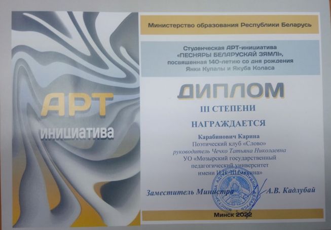 В рамках поэтического клуба “Слов” Карина подготовила музыкально-поэтическую миниатюру “Спадчына” по произведениям классика белорусской литературы Янки Купалы.
