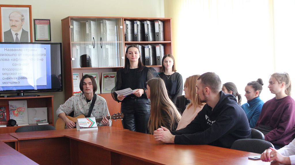 Студенты Кузнецов Арсений, Анисимова Ангелина, Воронич Алина, Моисеенко Мария рассказали о событиях войны в Афганистане, о том, как выполняли свой воинский долг наши солдаты, о том, что такое армейская взаимовыручка, а также факты из жизни афганского народа. Рассказ сопровождался показом презентации об истории тех событий. Стемпковская Мария подготовила и провела викторину. Присутствующим было предложено ответить на вопросы и совершить небольшой экскурс в историю афганской войны.