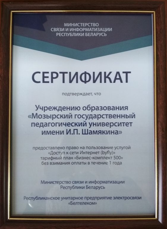 Шульган К.К. по окончанию встречи вручил ректору сертификат для университета на право пользования услугой «Доступ к сети Интернет (byfly)» – тарифный план «Бизнес-комплект 500».