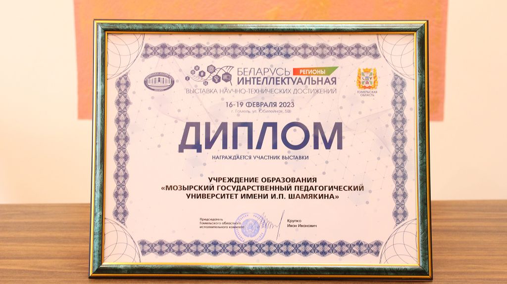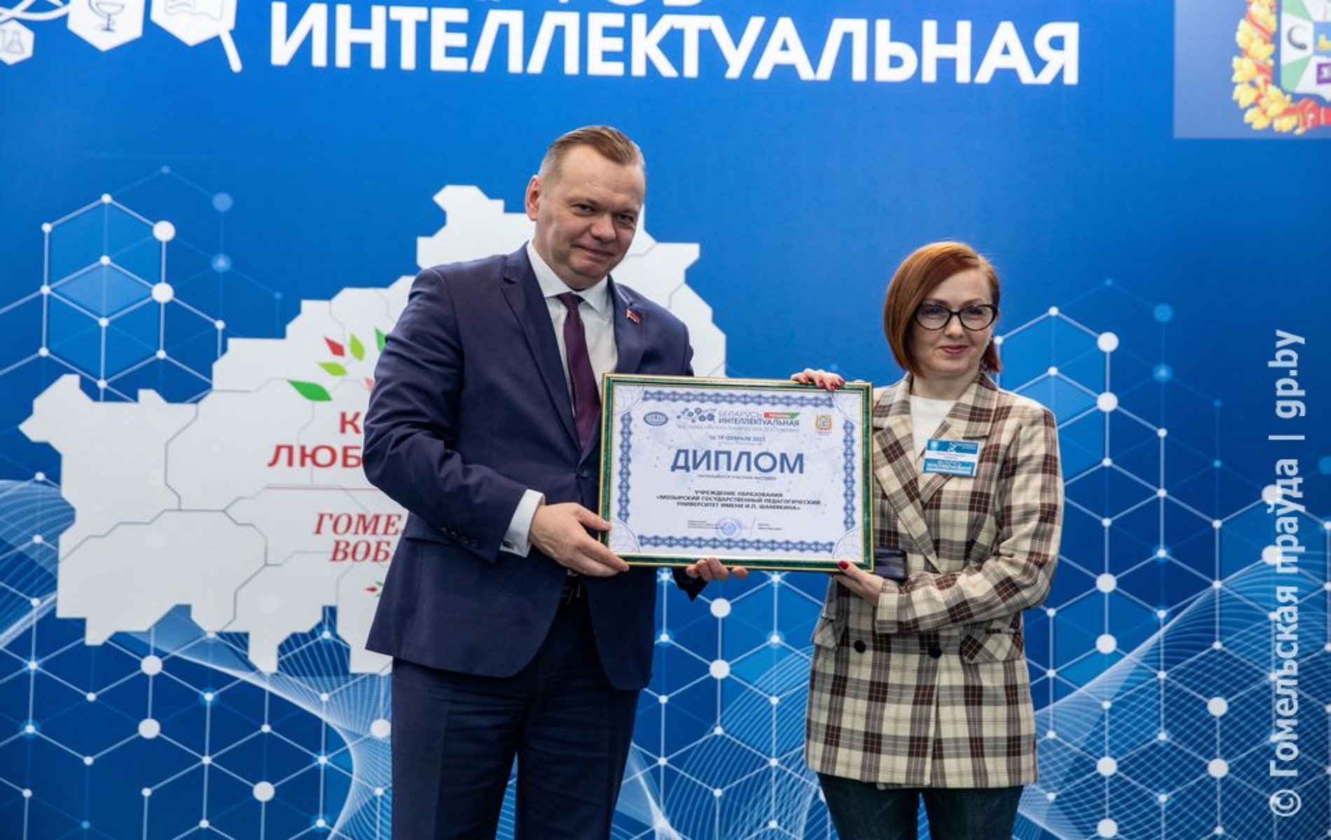 На торжественной церемонии закрытия выставки «Беларусь интеллектуальная» 19 февраля двадцать восемь организаций Гомельской области были отмечены дипломами. Среди них – наш университет. Награду за участие в выставке из рук заместителя председателя облисполкома Алейникова Д. В. получил представитель от библиотеки университета О. Г. Губкина.