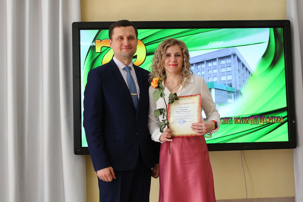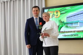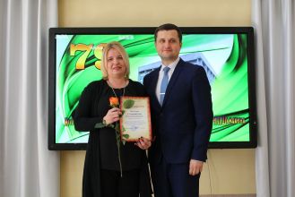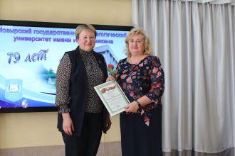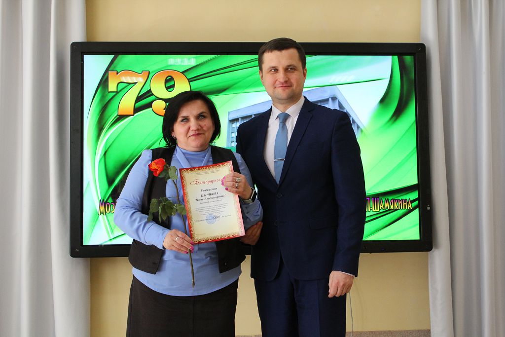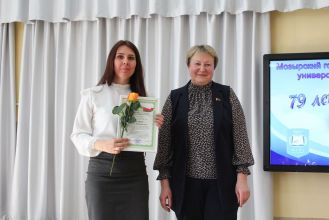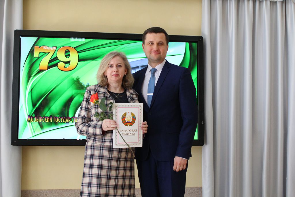 Со сцены звучали добрые слова поздравлений и от гостей мероприятия. Галина Михайловна Кудина, председатель Мозырского районного Совета депутатов, пожелала всем преподавателям успехов, стабильности, оптимизма, сохранения высокого уровня подготовки студентов и торжественно вручила награды сотрудникам нашего университета.
