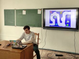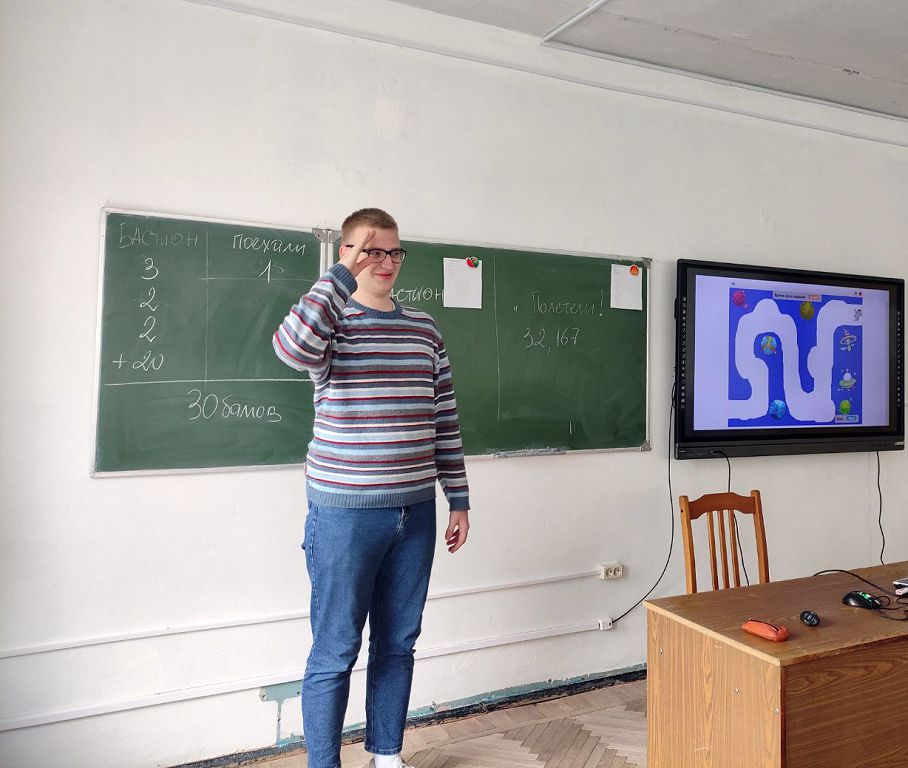 Далее студенты сыграли в увлекательную игру «Космическое путешествие», в ходе которой им пришлось отвечать на вопросы по прослушанному докладу, разгадывать ребусы на космическую тематику, составлять слова из букв и даже проходить компьютерную аркаду, разработанную для них в среде Scratch.