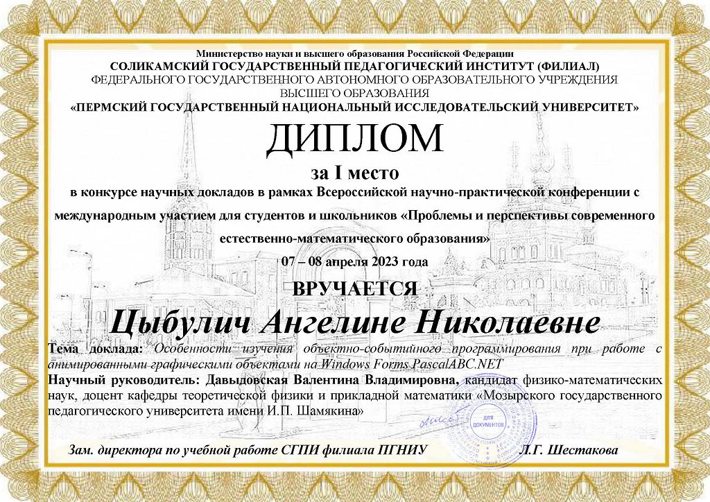 Работа, выполненная Цыбулич А.Н. «Особенности изучения объектно-событийного программирования при работе с анимированными графическими объектами на Windows Forms PascalABC.NET» (научный руководитель: Давыдовская. В.В., канд. ф.-м. н., доц., доц. каф. теор. физ. и прикл. инф.) была удостоена диплома первой степени.