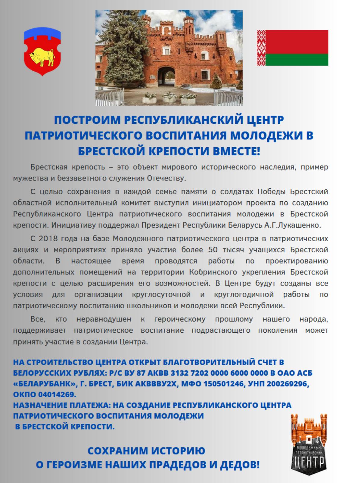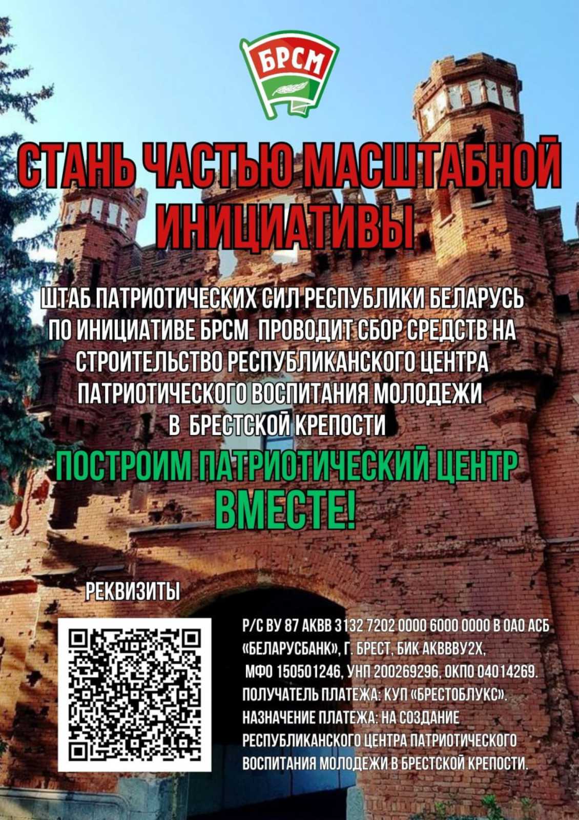 ПОСТРОИМ РЕСПУБЛИКАНСКИЙ ЦЕНТР ПАТРИОТИЧЕСКОГО ВОСПИТАНИЯ МОЛОДЕЖИ В БРЕСТСКОЙ КРЕПОСТИ ВМЕСТЕ