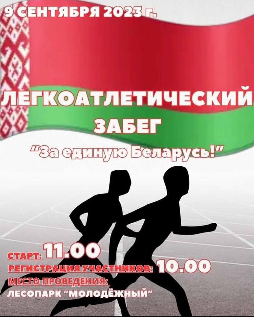 легкоатлетический забег "За единую Беларусь" Подробности Опубликовано 05.09.2023 14:05 9 сентября в лесопарке "Молодежный" пройдет легкоатлетический забег "За единую Беларусь", посвященный Дню народного единства