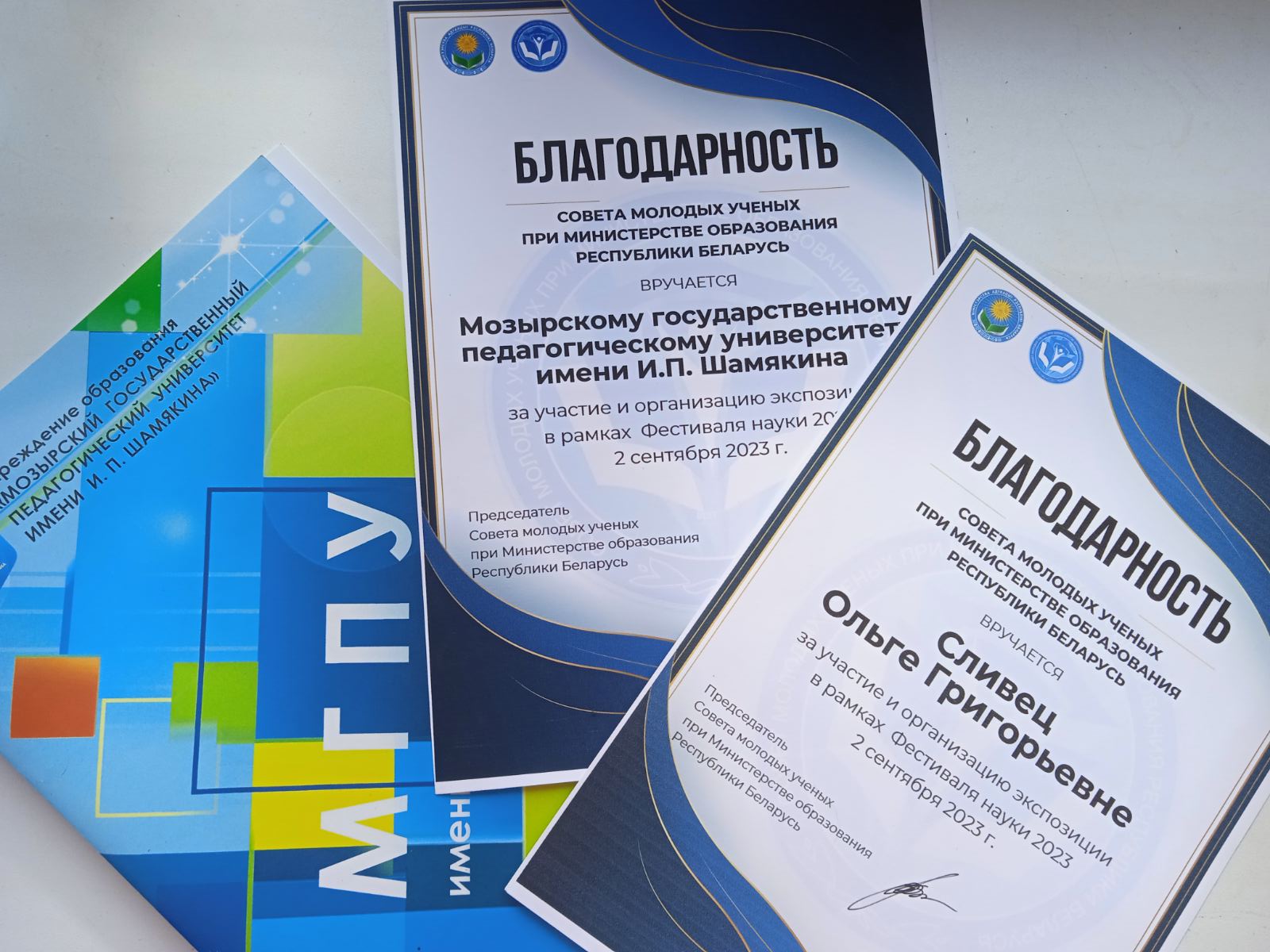 День научной молодёжи в Новополоцке стал региональным этапом «Фестиваля науки – 2023», который прошёл 02 сентября в Минске, на площадке Центрального ботанического сада. За участие и организацию экспозиции в рамках Фестиваля Мозырский государственный педагогический университет имени И. П. Шамякина был отмечен благодарностью от Совета молодых учёных при Министерстве образования Республики Беларусь.