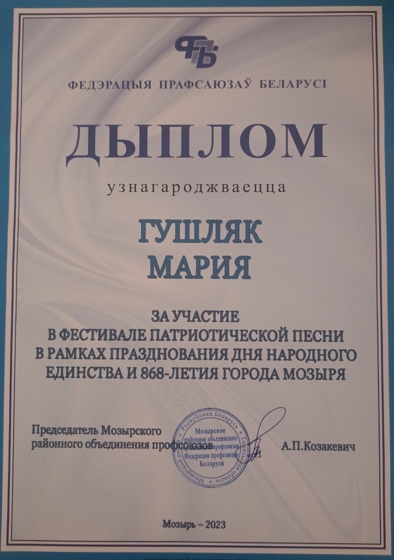 Мы поздравляем Марию Гушляк, студентку факультета дошкольного и начального образования, с достойным выступление на фестивале и завоеванием очередного диплома.
