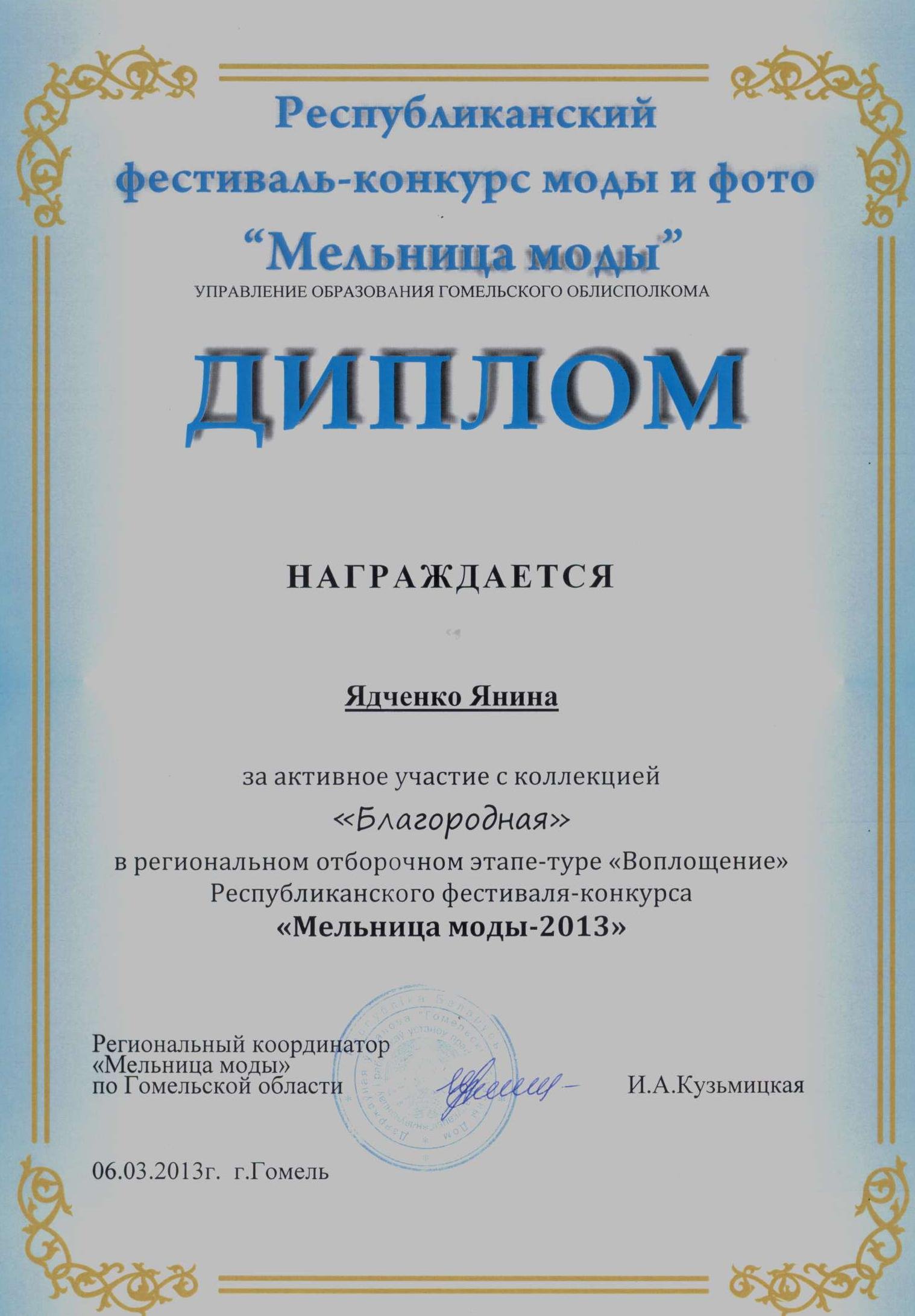 3 декабря 2012 года состоялся первый эскизный тур XXII Республиканского фестиваля-конкурса моды и фото «Мельница моды-2013», который проходил в г. Гомеле. Эскизы Ядченко Яны успешно прошли в следующий тур «Воплощение».