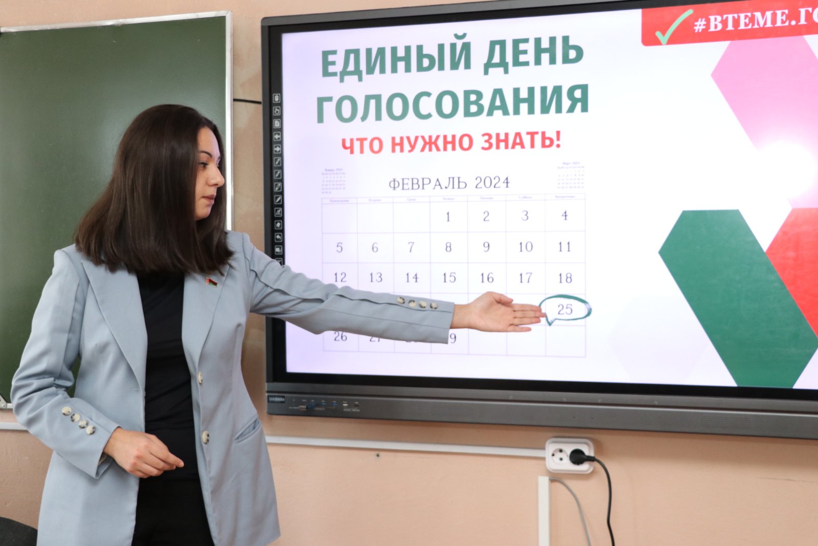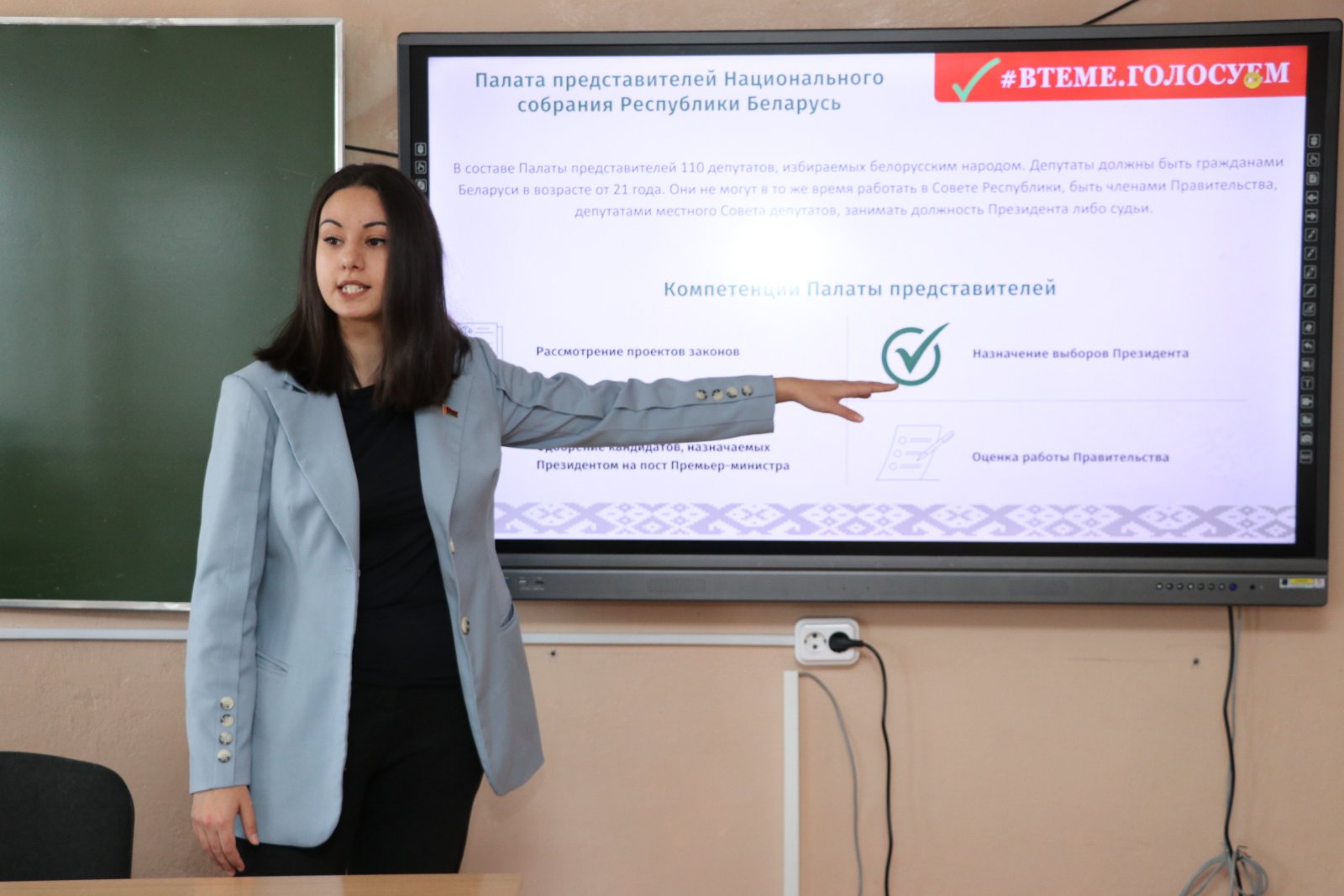 Студентам ещё раз напомнили о системе государственного устройства в Республике Беларусь, о работе депутатов местных Советов депутатов, структуре и компетенциях сельских, районных, областных Советов, об условиях выдвижения кандидатов в депутаты и др. 25 февраля 2024 года в единый день голосования будут избираться депутаты Палаты представителей Национального собрания Республики Беларусь восьмого созыва и местных Советов депутатов двадцать девятого созыва.