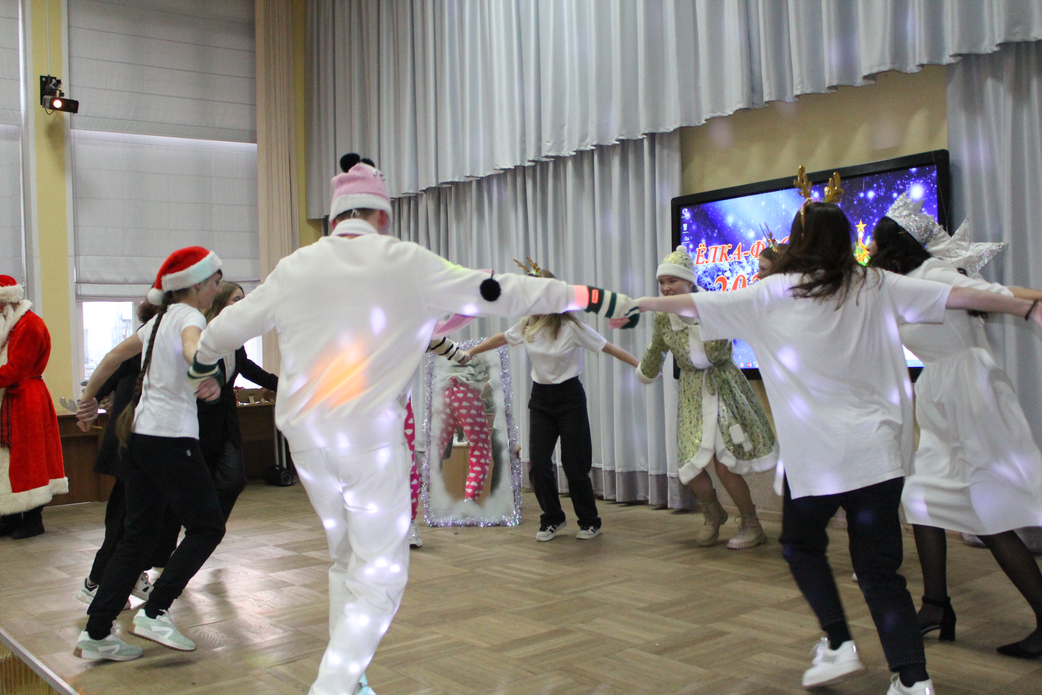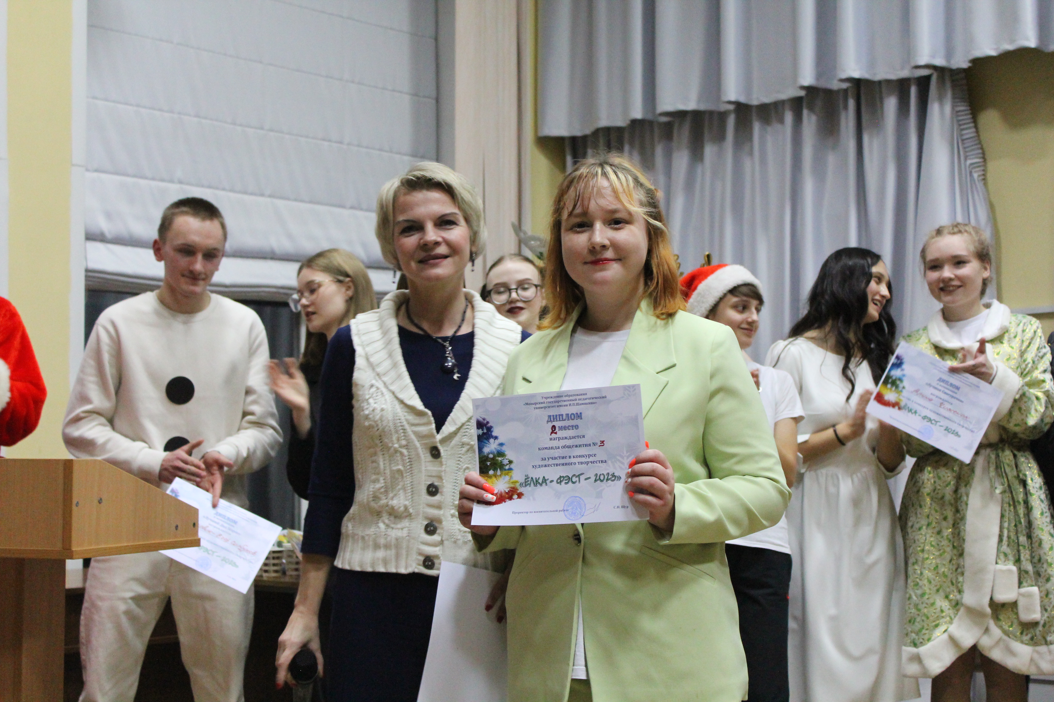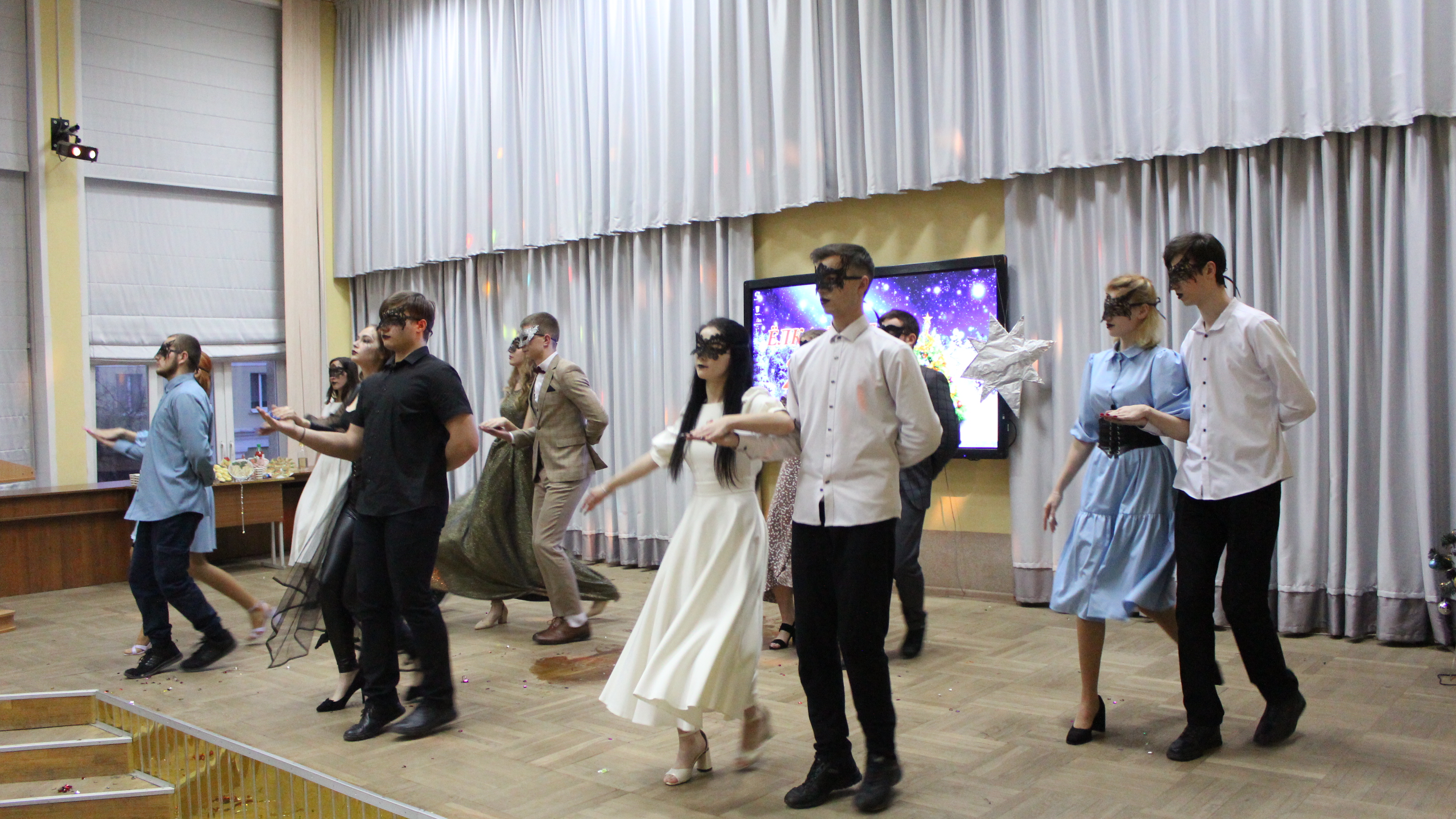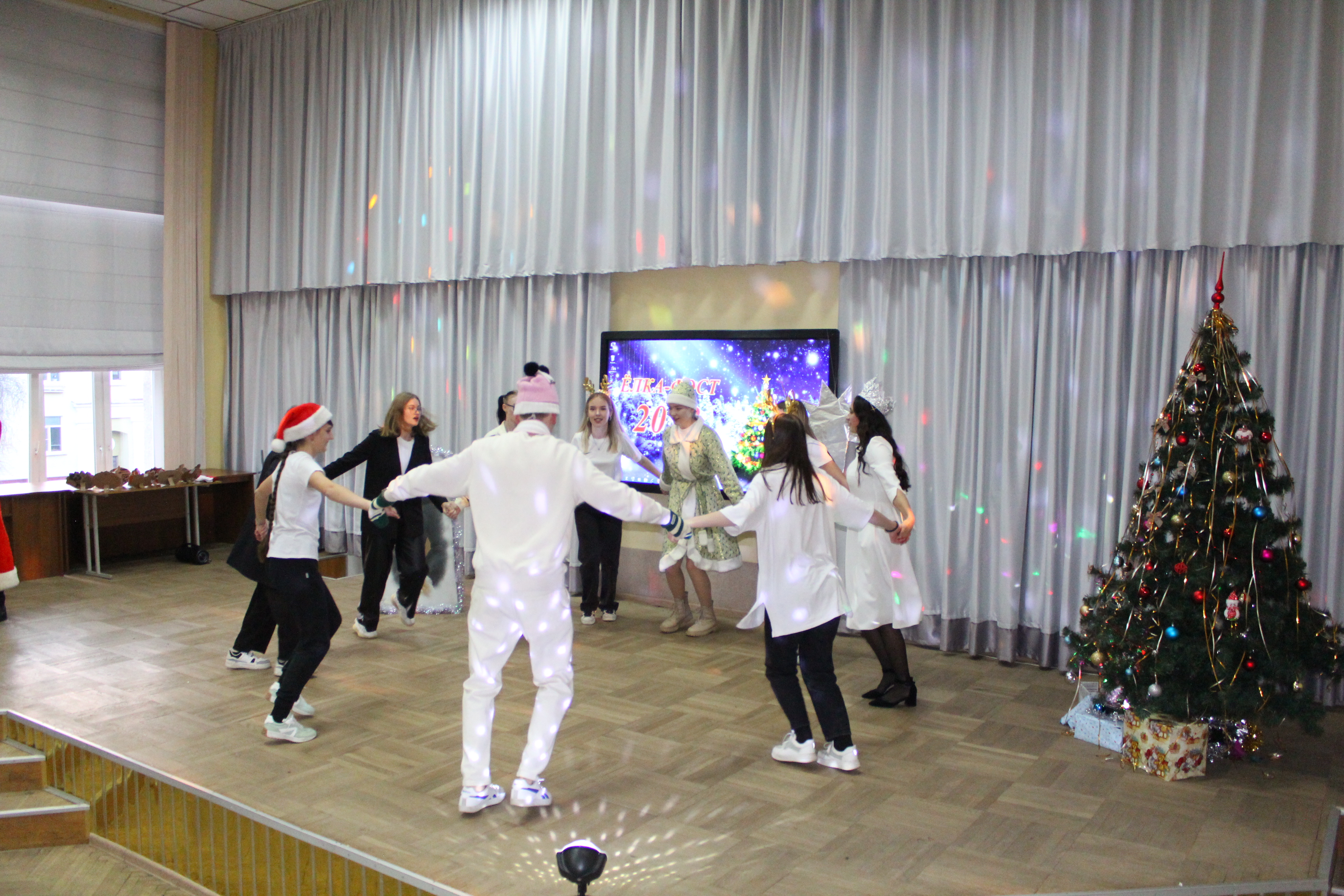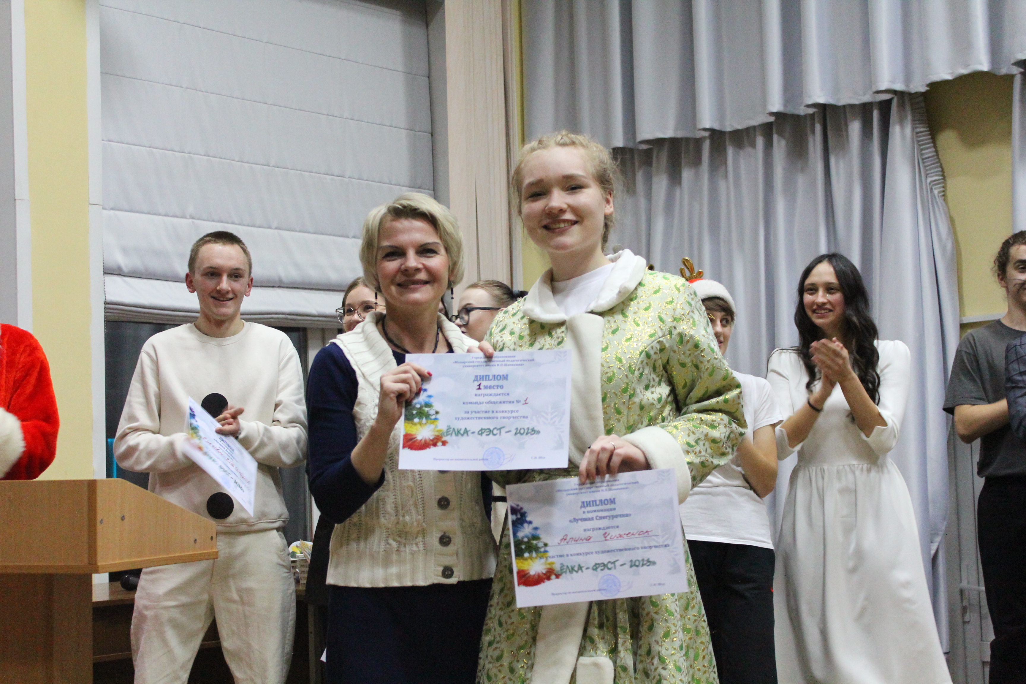 1 – е место разделили между собой команды общежитий №1 и №2, а 2 – место досталось общежитию №3. В номинациях «Лучший Дед Мороз», «Лучшая Снегурочка» были представители общежития №1 – Егор Салбуков и Алина Чиженок. Титул «Королевы» достался председателю студенческого совета общежития №2 Анне Савицкой, а в номинации «Лучший танцор» победил Алексей Ангел с общежития №3.