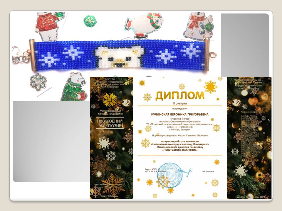 Кучинская Вероника, студентка 4 курса, в номинации «Новогодний аксессуар к костюму (бижутерия)» (руководитель: С.И.Карась);