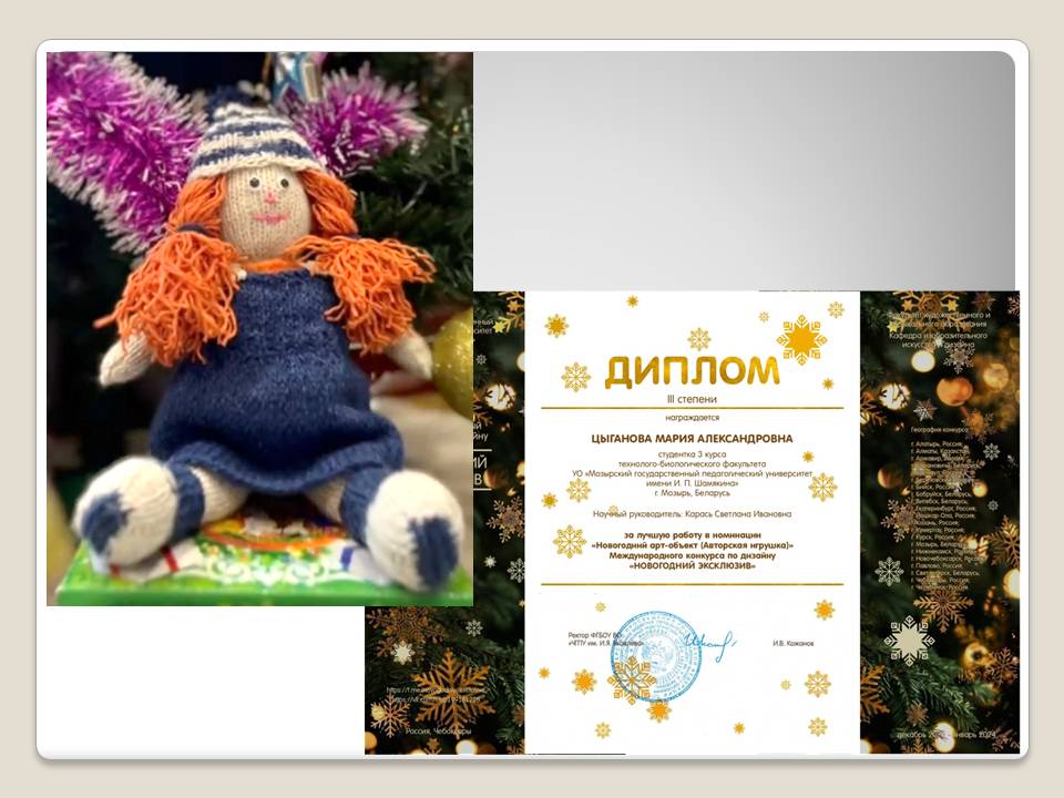 Цыганова Мария, студентка 3 курса, в номинации «Новогодний арт-объект (авторская игрушка)» (руководитель: С.И.Карась).