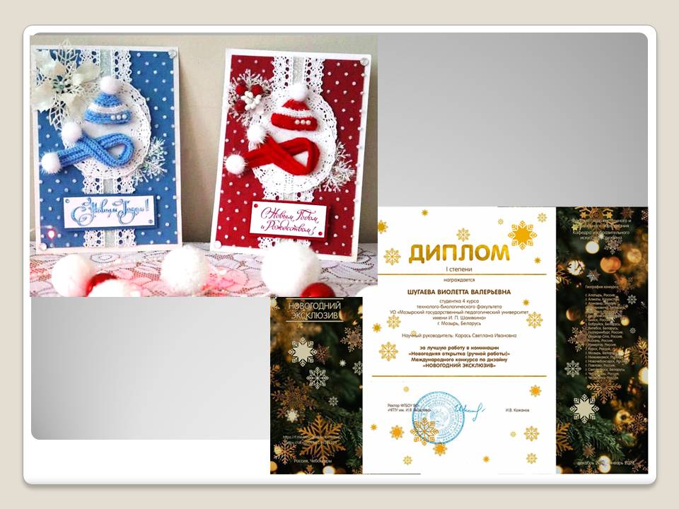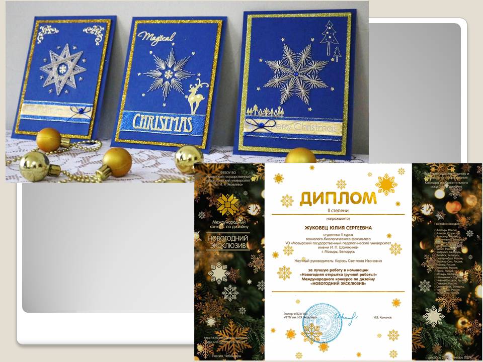 Жуковец Юлия, студентка 4 курса, в номинации «Новогодняя открытка (ручной работы» (руководитель: С.И.Карась);