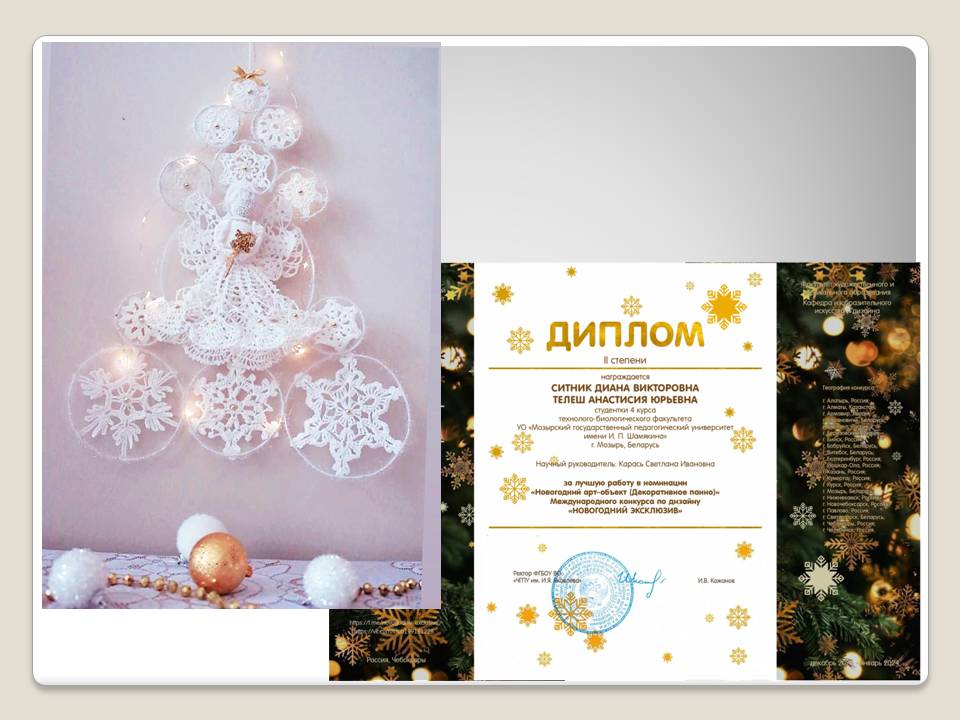 Ситник Диана и Телеш Анастасия, студентки 4 курса, в номинации «Новогодний арт-объект (декоративное панно)» (руководитель: С.И.Карась);