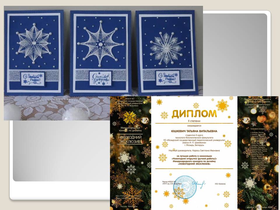 Юшкевич Татьяна, студентка 4 курса, в номинации «Новогодняя открытка (ручной работы» (руководитель: С.И.Карась);