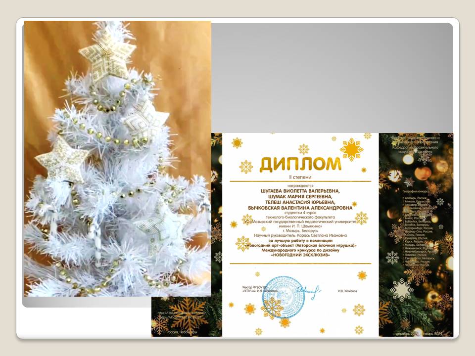 Телеш Анастасия, Шугаева Виолетта, Шумак Мария, Бычковская Валентина, студентки 4 курса, в номинации «Новогодний арт-объект (ёлочная игрушка)» (руководитель: С.И.Карась);