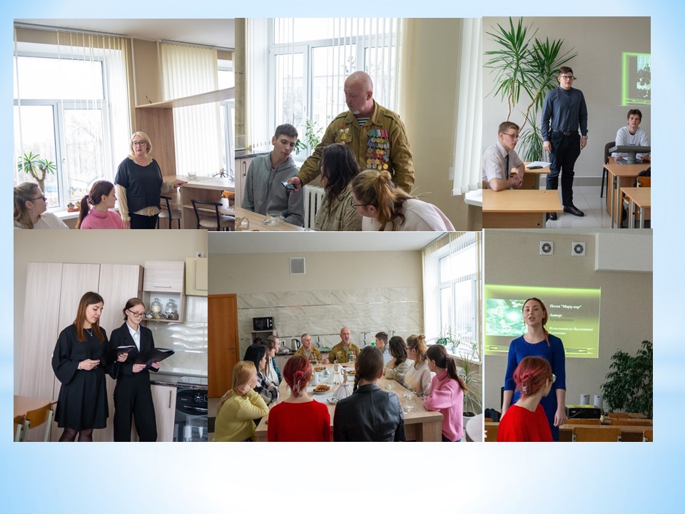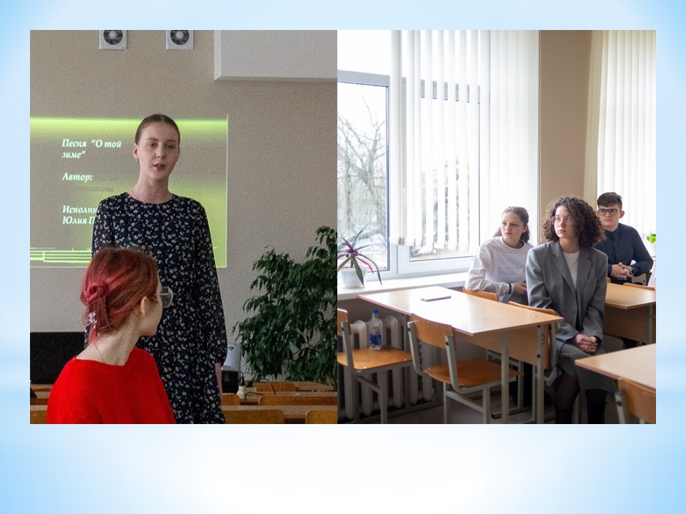 Дополнением истории страшной войны стали эмоциональные выступления студентов факультета И. Таргонского, А. Слуки, В. Жукова, В. Былицкой, декламировавших стихотворения на военную тему, а также музыкальные номера в исполнении Ю. Попко, В. Кохненко.