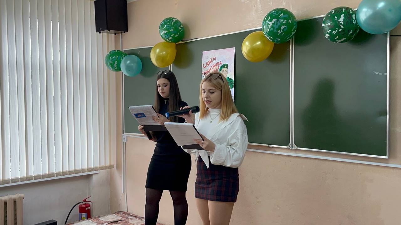 Ведущие праздника – Морозова Анна и Спадобаева Алина – поздравили присутствующих мужчин-преподавателей с Днем защитника Отечества, пожелали крепкого здоровья и успехов в работе.