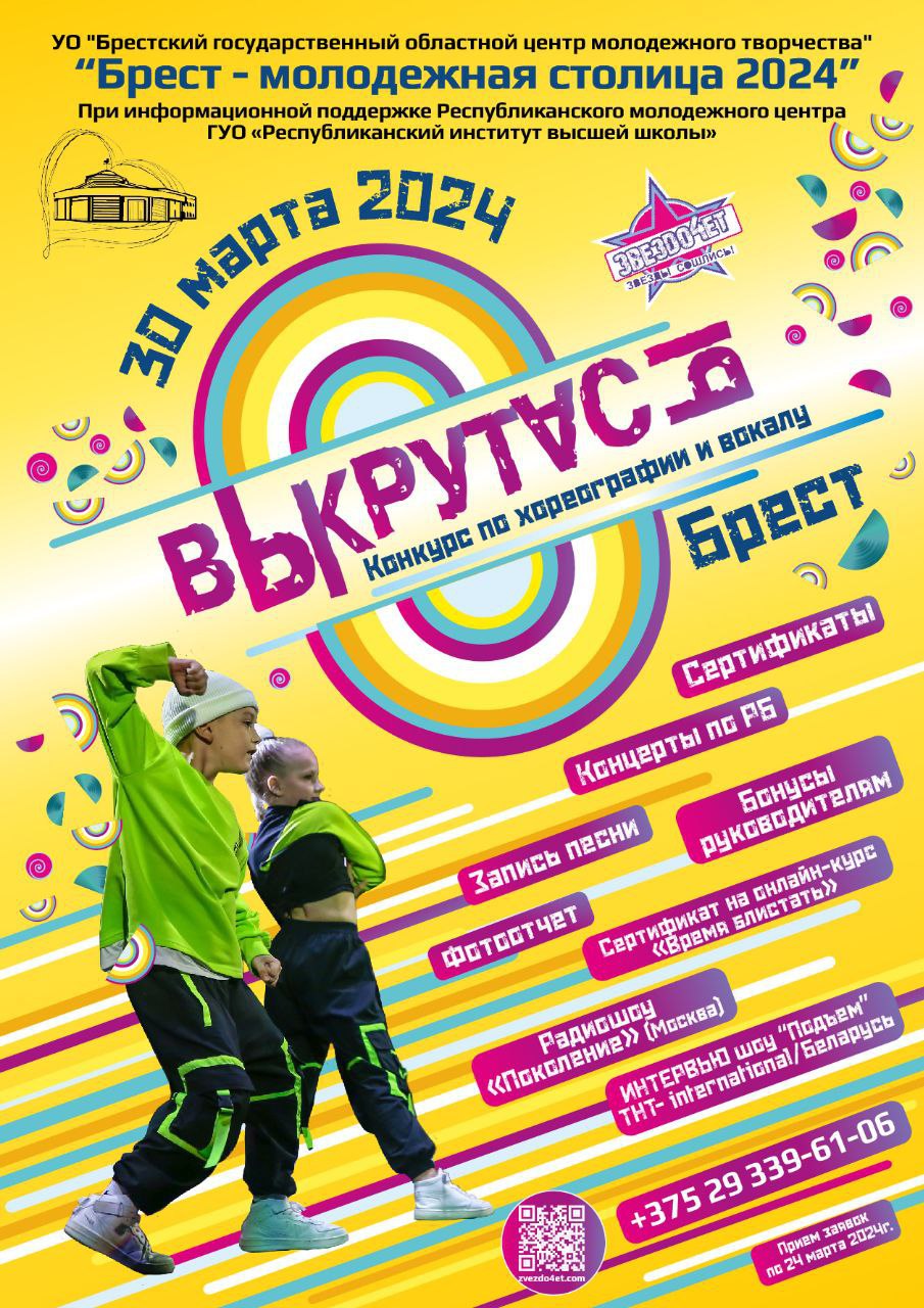 IV-й открытый республиканский фестиваль по вокалу и хореографии «ВЫКРУТАСЫ» в рамках звания «Брест - молодежная столица 2024» приглашает танцоров и вокалистов получить звание лучшего в Бресте 30 марта 2024 года!