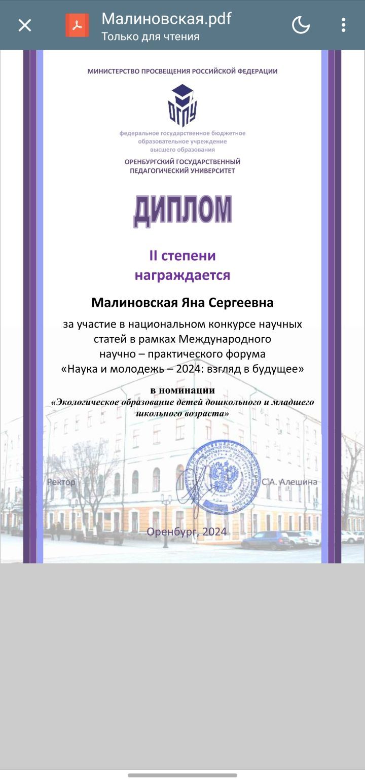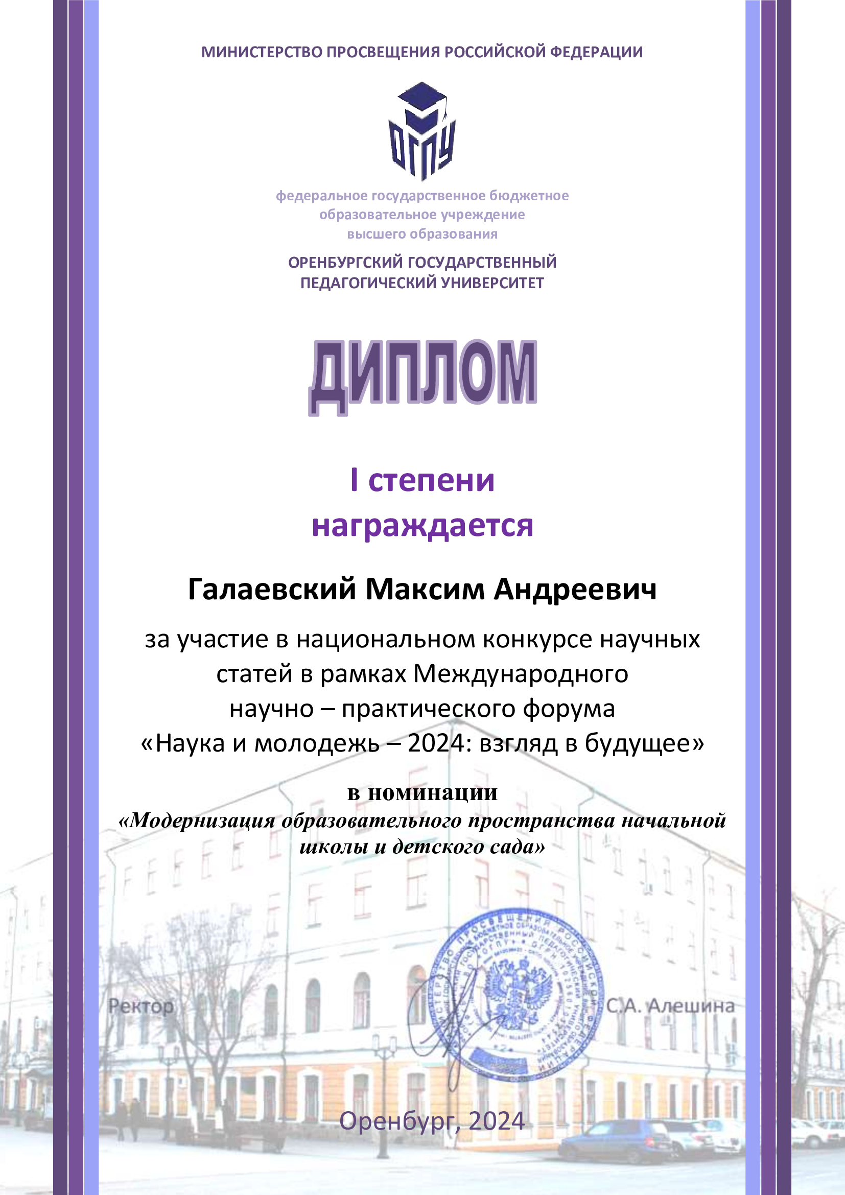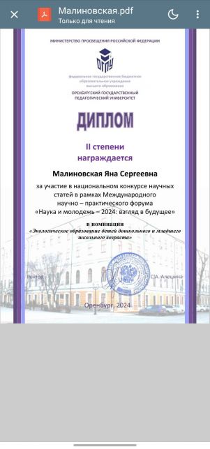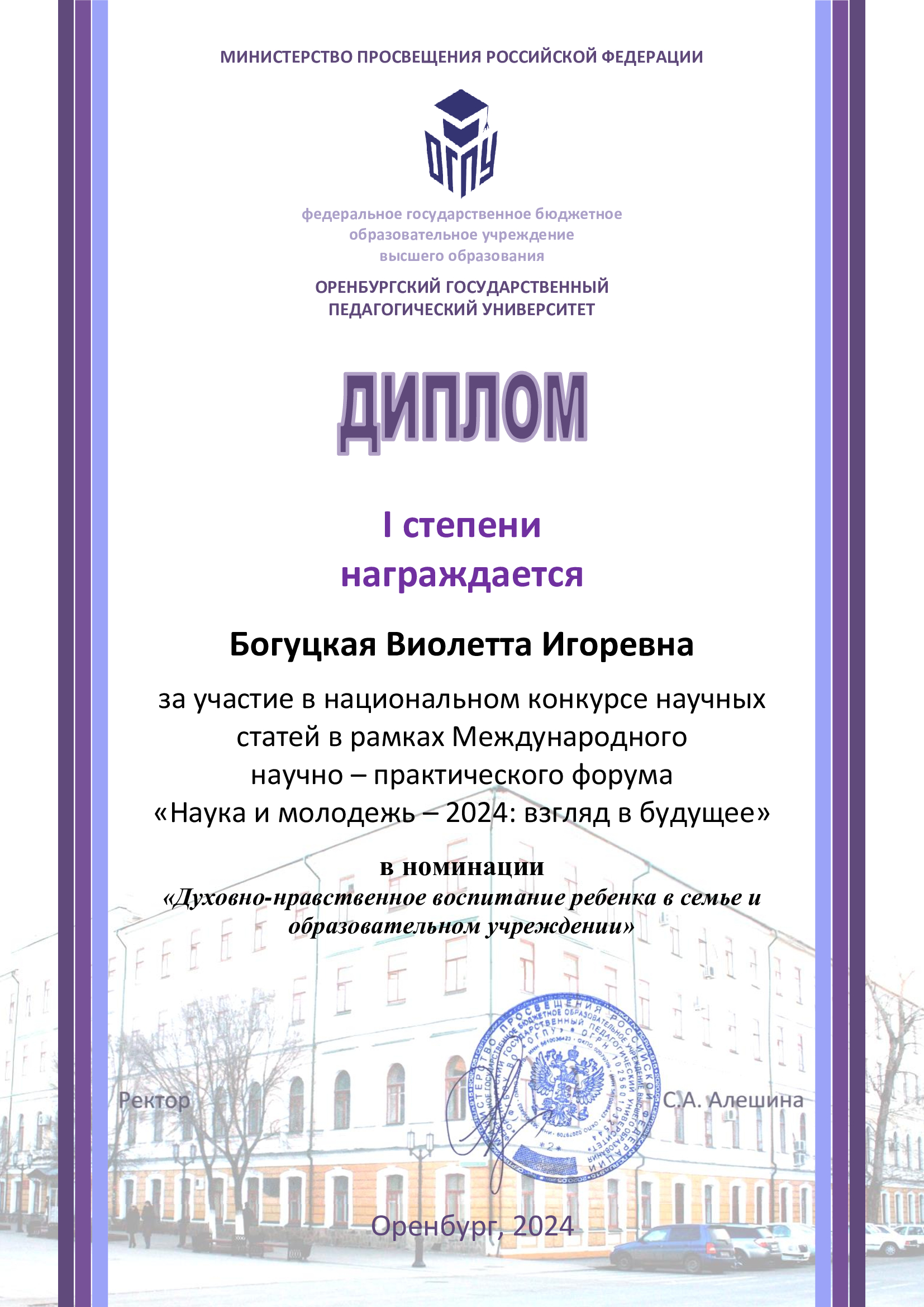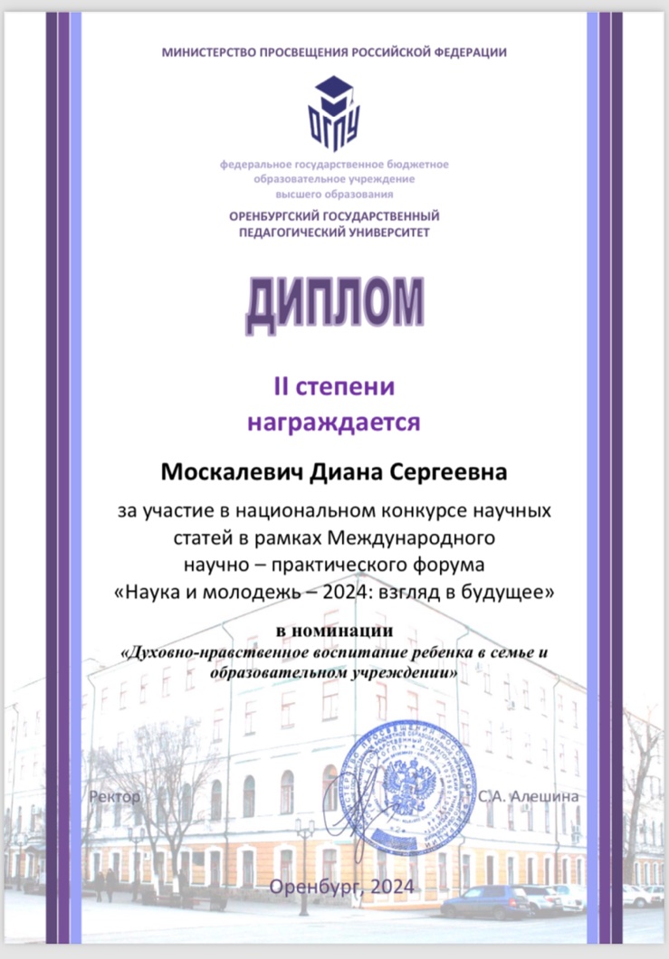 Так под руководством преподавателей кафедры студенты и магистранты приняли участие в Международной научно-практической конференции «Молодёжь Сибири – науке России» в г. Красноярске и в Международной научно-практической конференции «Наука и молодёжь – 2024: взгляд в будущее» в г. Оренбурге. В рамках данной конференции студентами и магистрантами были получены дипломы в следующих номинациях: «Духовно-нравственное воспитание ребёнка в семье и в общеобразовательном учреждении» - диплом II степени, научный руководитель доцент Борисенко О.Е., диплом I степени, научный руководитель старший преподаватель Кочубей О.С.; «Экологическое образование детей дошкольного и младшего школьного возраста» - диплом II степени, научный руководитель доцент Иванова Л.Н.; «Модернизация образовательного пространства начальной школы и детского сада» - диплом I степени, начный руководитель старший преподаватель Карпович И.А.