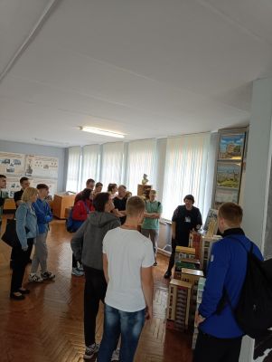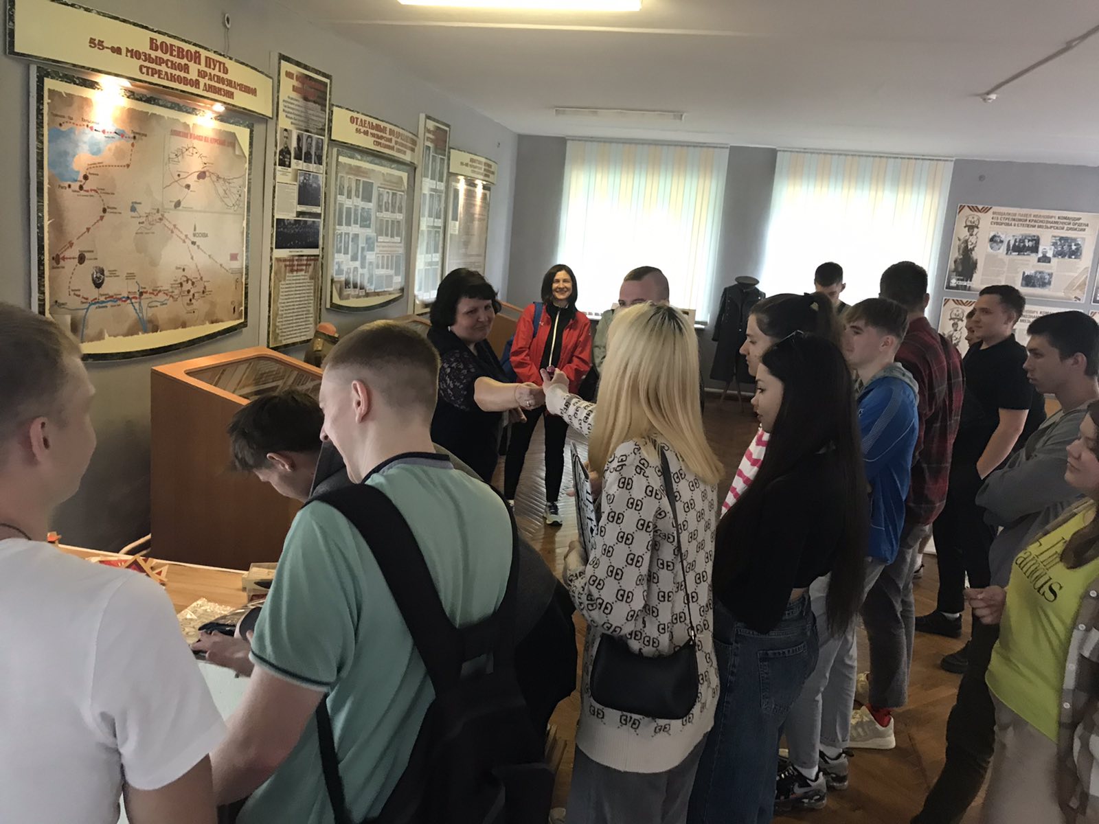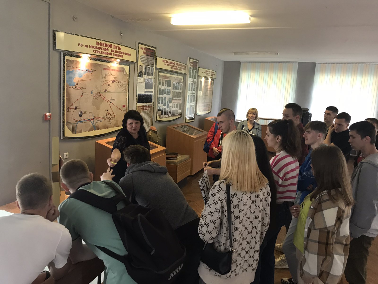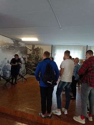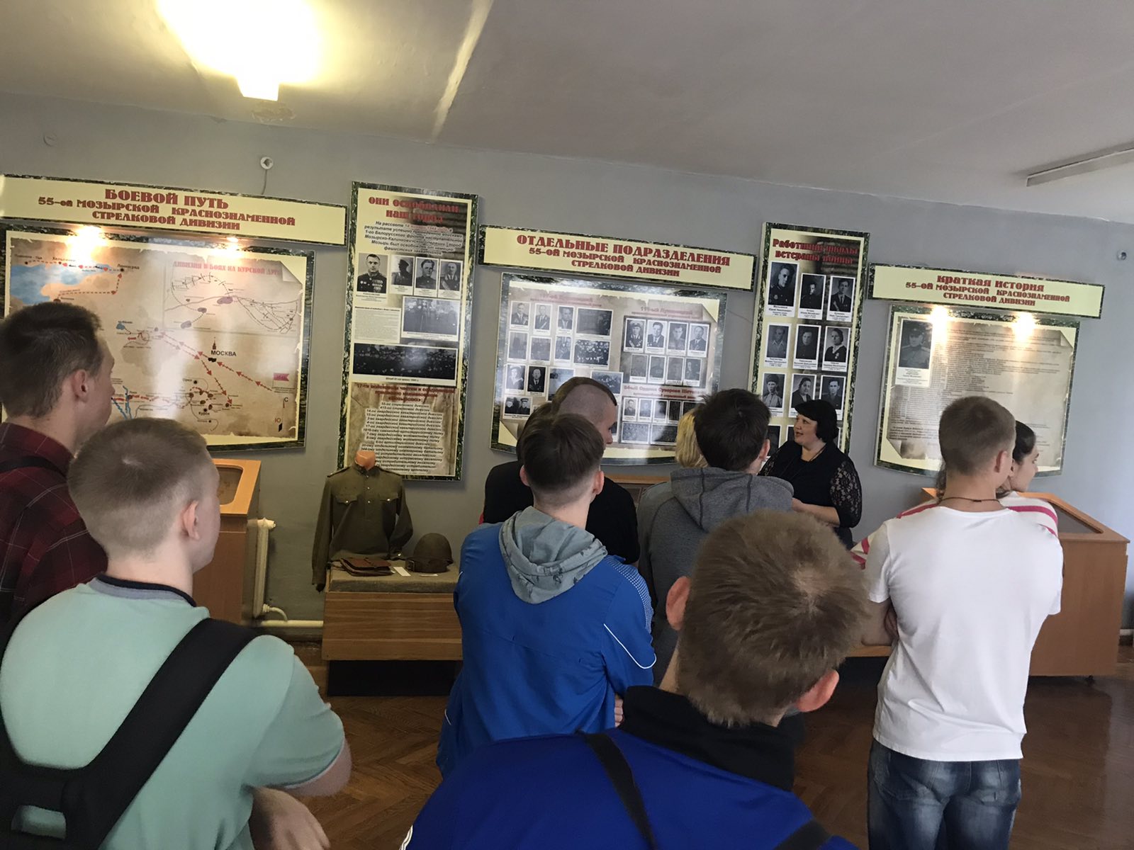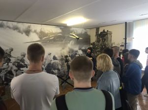 Музей имеет свой уникальный дизайн-проект. На первом этаже экспозиция представлена в виде поезда «Музей-памяти», где каждый вагон несет свою информацию и смысловую нагрузку. Экскурсовод Кузьмич Татьяна Адамовна рассказала о боевом пути 55-й Мозырской Краснознаменной стрелковой дивизии под командованием генерал-майора Н. В. Игнатова, ознакомила с имеющимися в музее экспозициями. Особый интерес вызывали предметы быта советских солдат. В ходе экскурсии был проведен увлекательный квест.