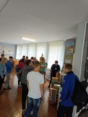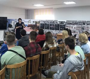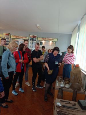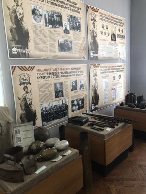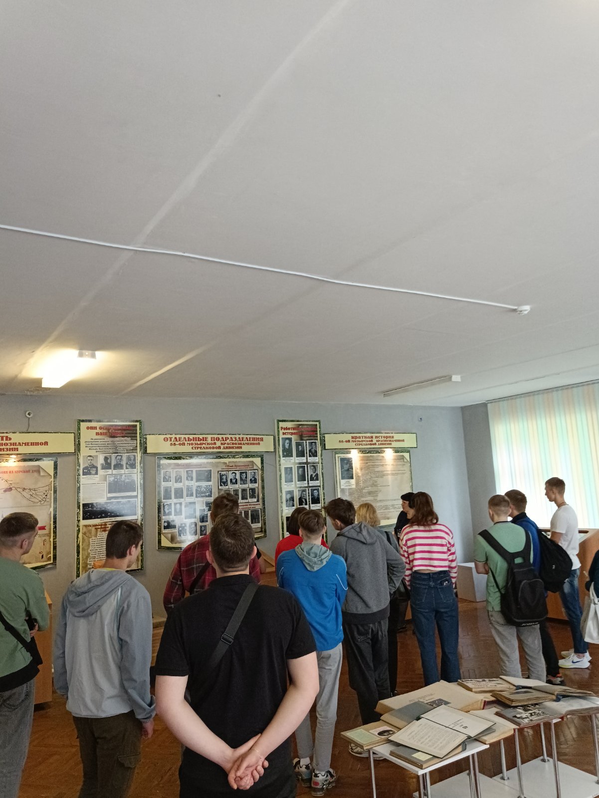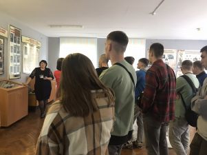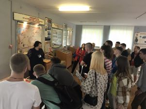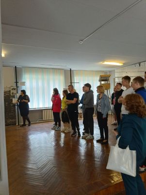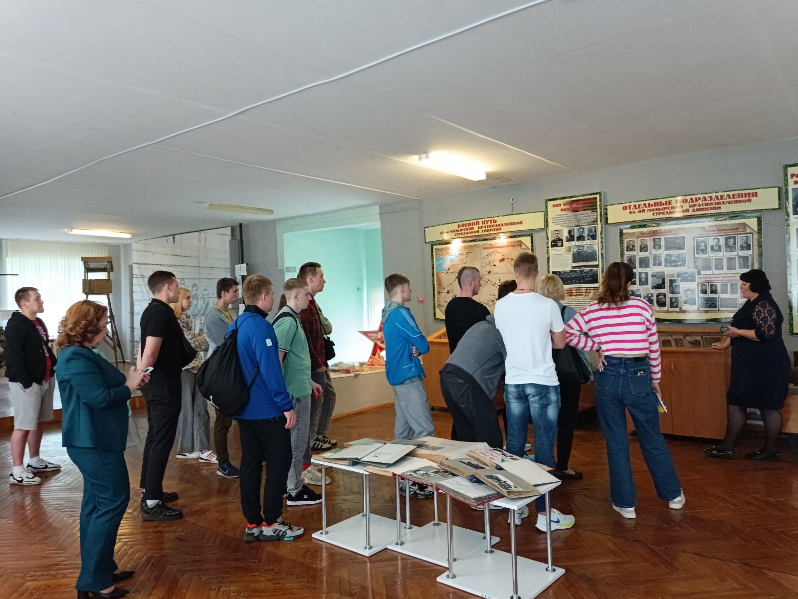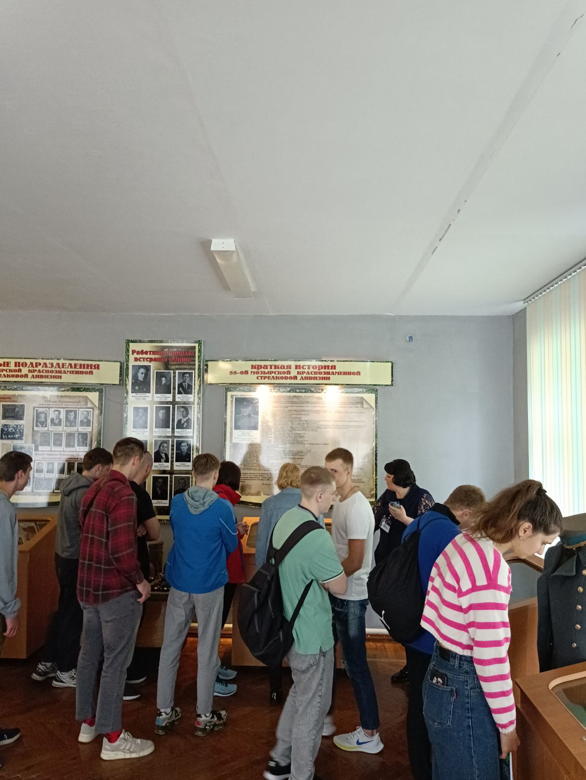 Музей имеет свой уникальный дизайн-проект. На первом этаже экспозиция представлена в виде поезда «Музей-памяти», где каждый вагон несет свою информацию и смысловую нагрузку. Экскурсовод Кузьмич Татьяна Адамовна рассказала о боевом пути 55-й Мозырской Краснознаменной стрелковой дивизии под командованием генерал-майора Н. В. Игнатова, ознакомила с имеющимися в музее экспозициями. Особый интерес вызывали предметы быта советских солдат. В ходе экскурсии был проведен увлекательный квест.