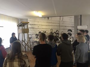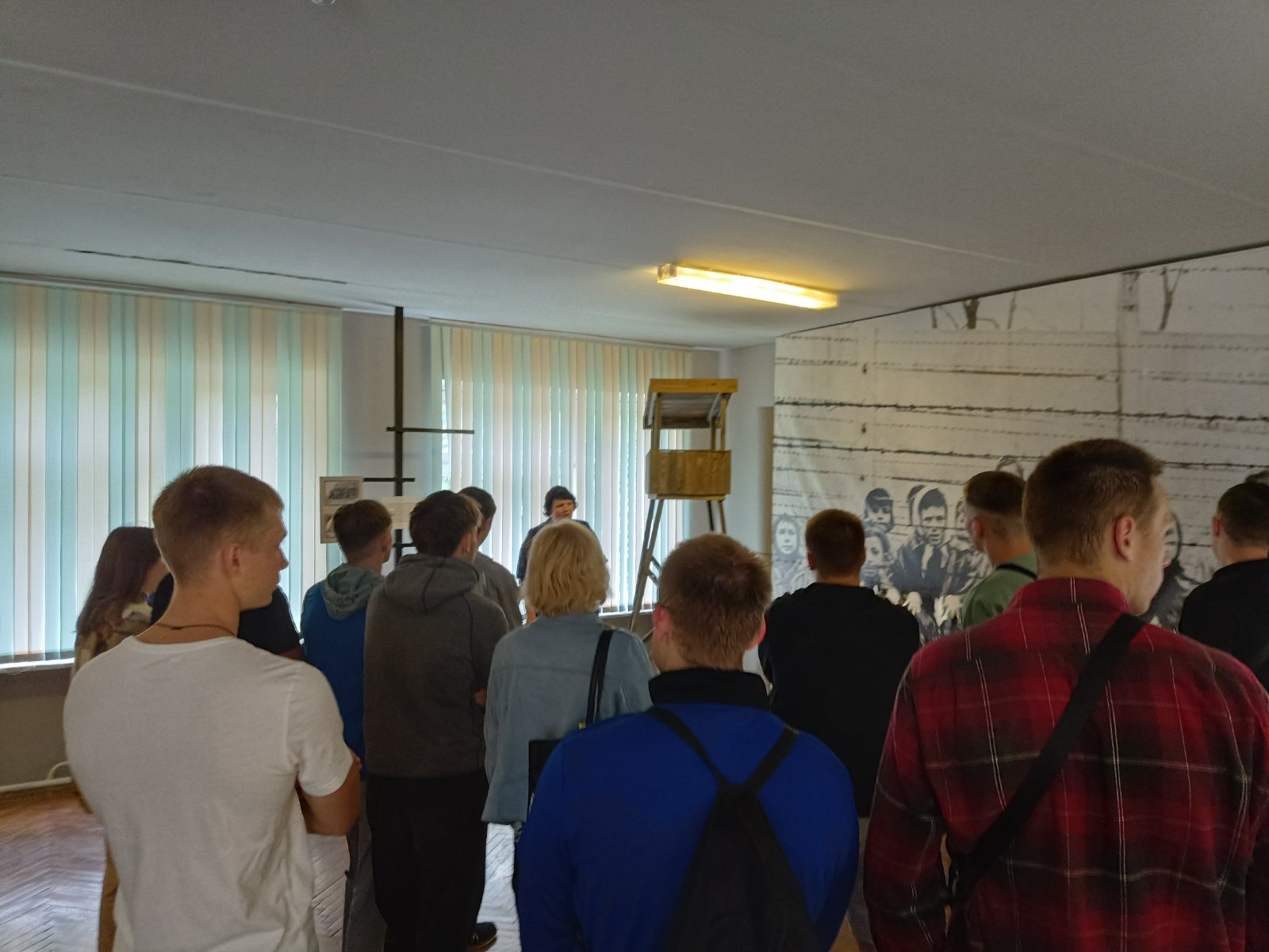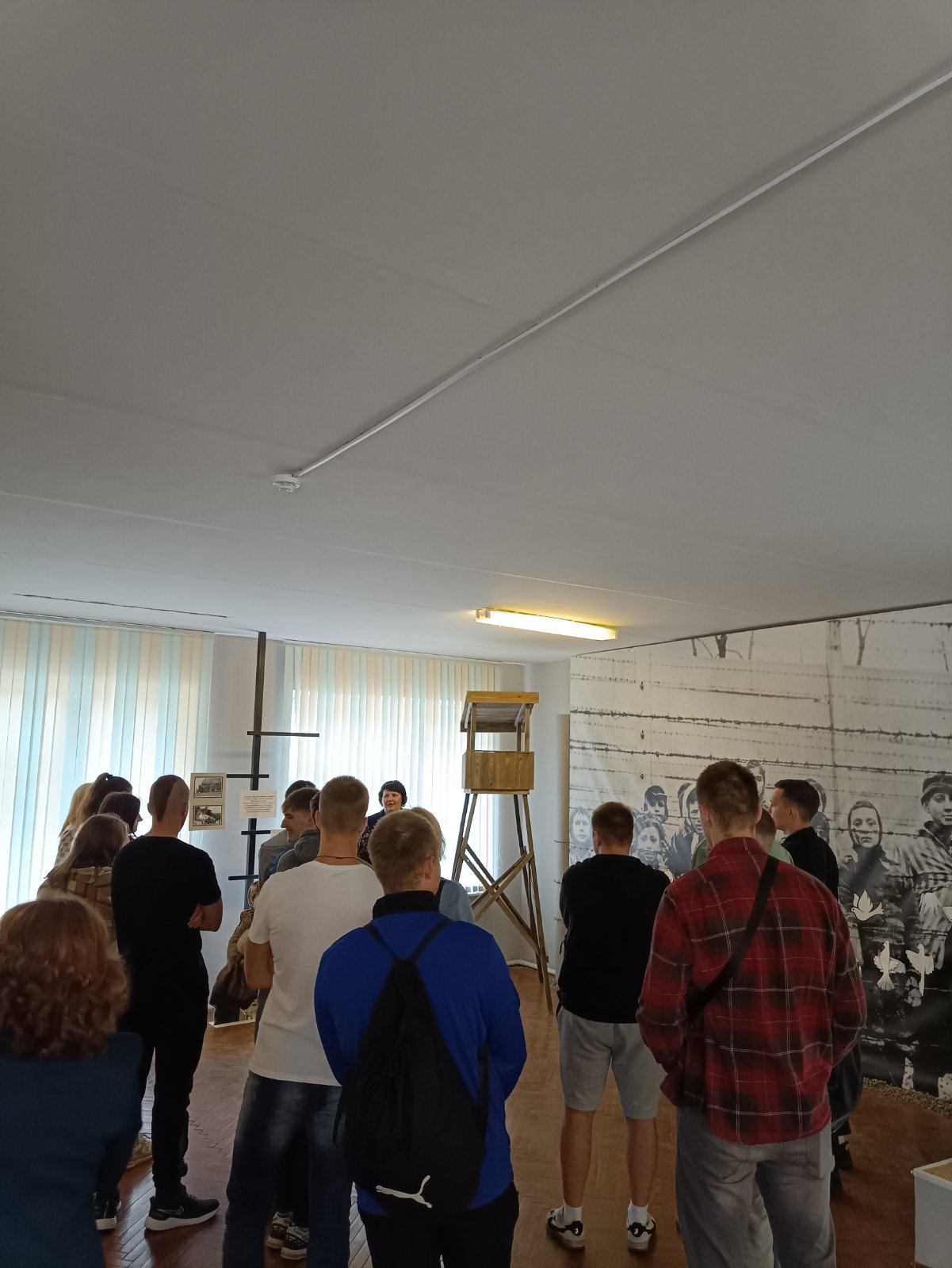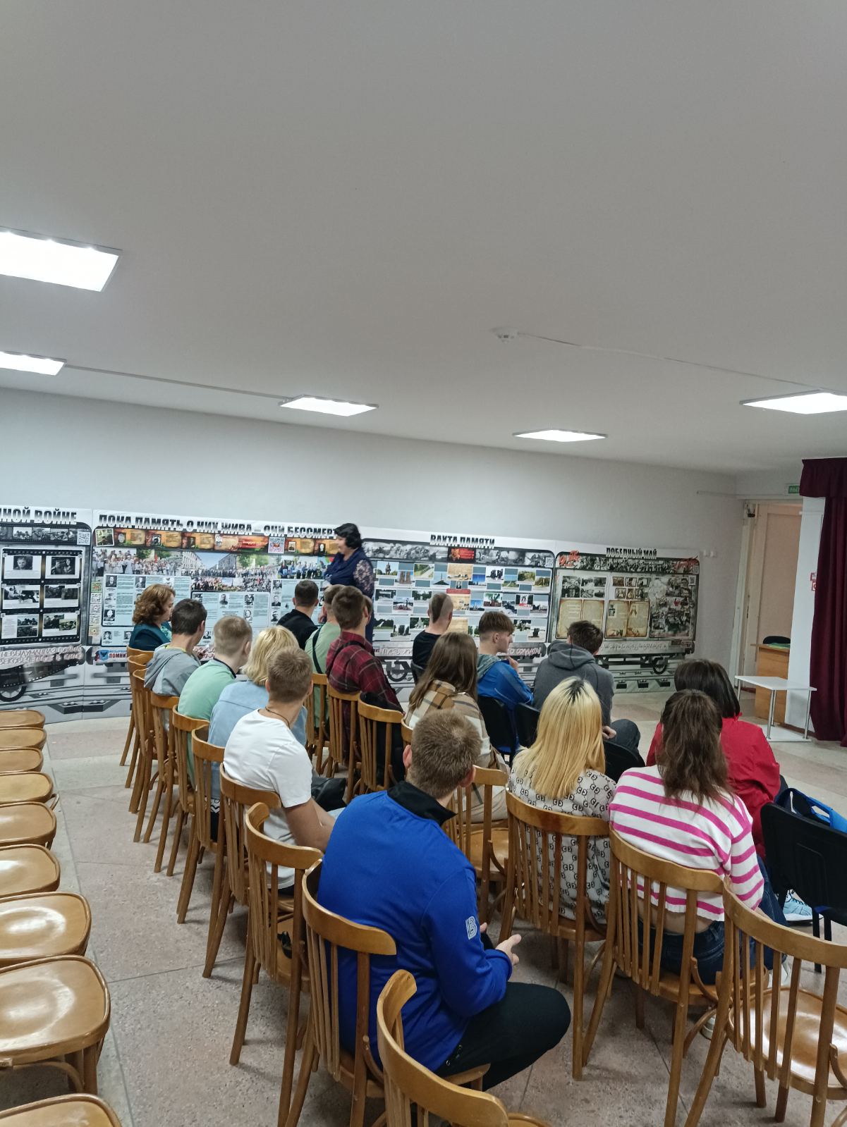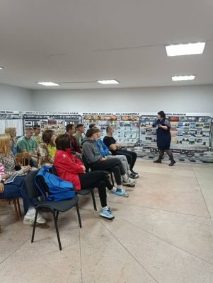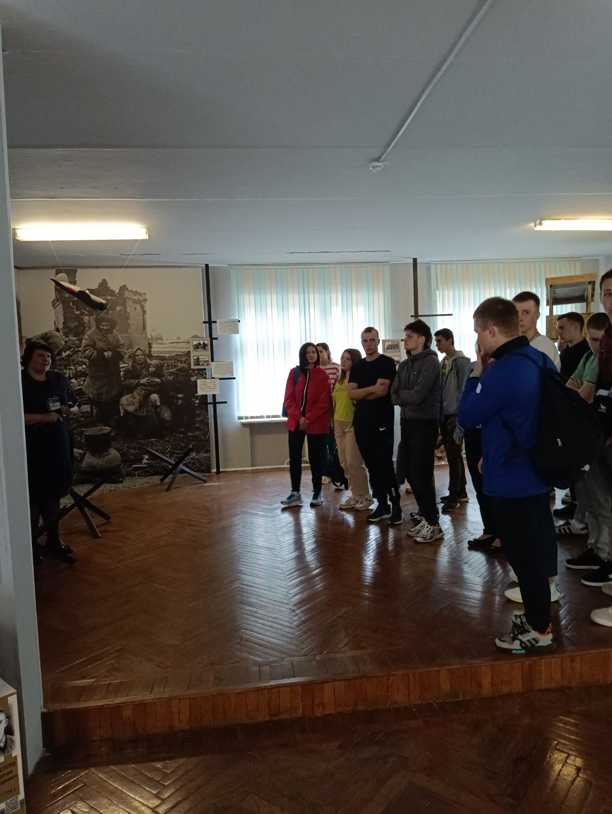 Музей имеет свой уникальный дизайн-проект. На первом этаже экспозиция представлена в виде поезда «Музей-памяти», где каждый вагон несет свою информацию и смысловую нагрузку. Экскурсовод Кузьмич Татьяна Адамовна рассказала о боевом пути 55-й Мозырской Краснознаменной стрелковой дивизии под командованием генерал-майора Н. В. Игнатова, ознакомила с имеющимися в музее экспозициями. Особый интерес вызывали предметы быта советских солдат. В ходе экскурсии был проведен увлекательный квест.