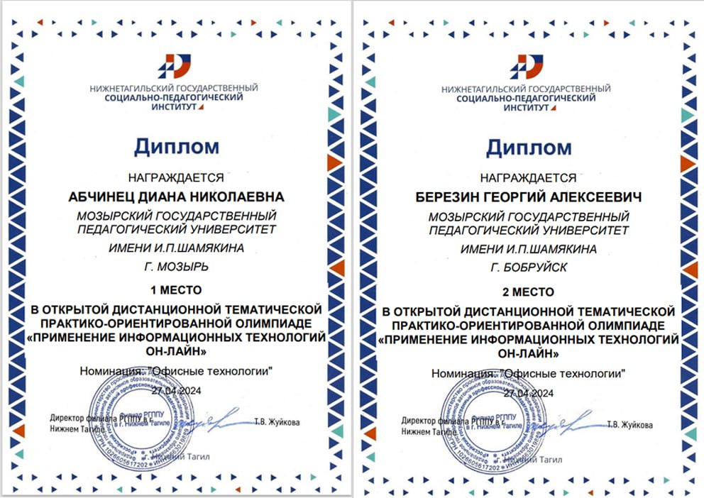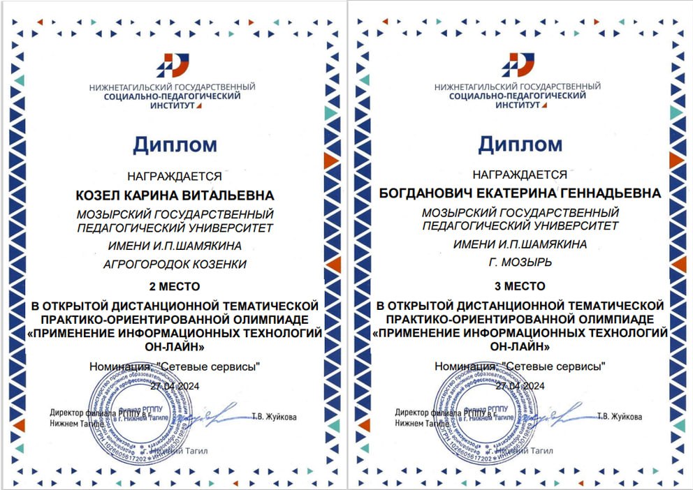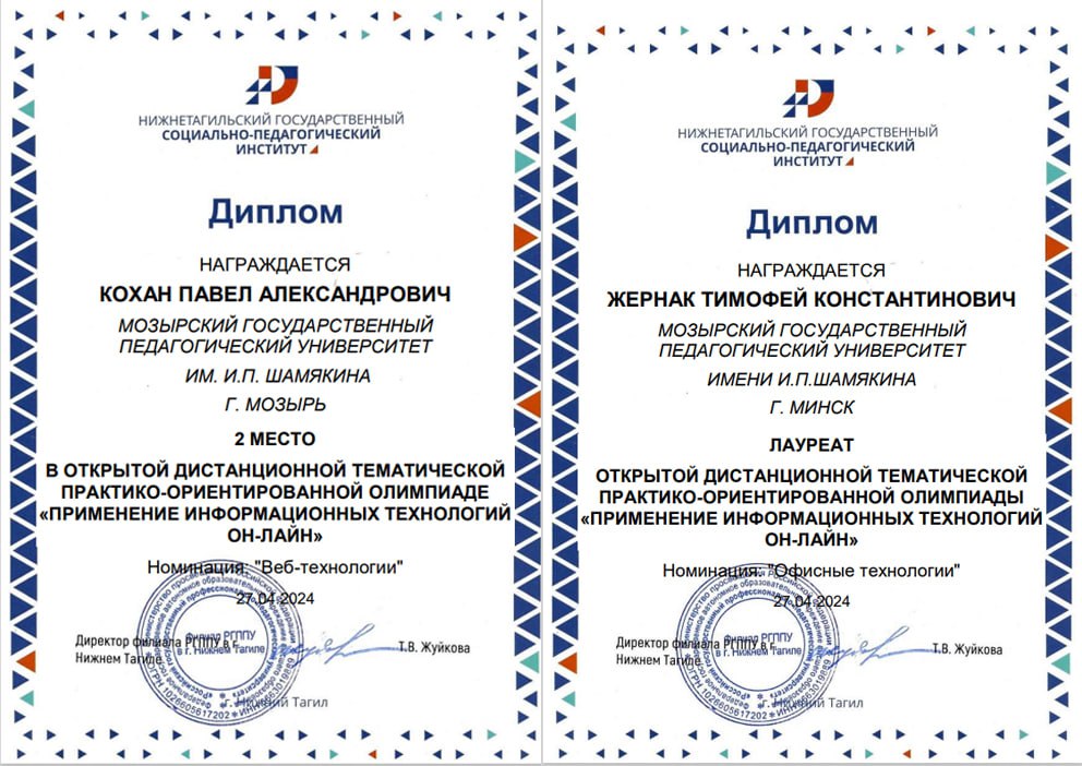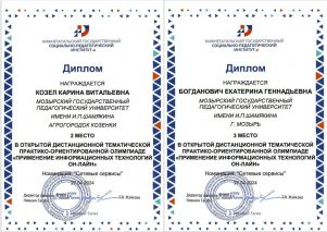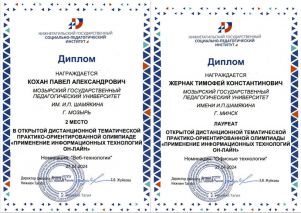 Кохан П. (3 к., 1 гр. - Диплом 2 ст. "Веб технологии"), Абчинец Д. (2 к., 1 гр. - Диплом 1 ст. "Офисные технологии on-line"), Козел К. (1 к., 1 гр. - Диплом 2 ст. "Интернет и сетевые сервисы"), Богданович Е. (1 к., 1 гр. - Диплом 3 ст. "Интернет и сетевые сервисы"), Березин Г. (1 к., 1 гр. - Диплом 2 ст. "Офисные технологии on-line").