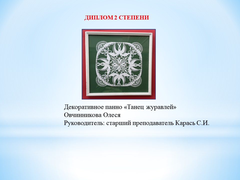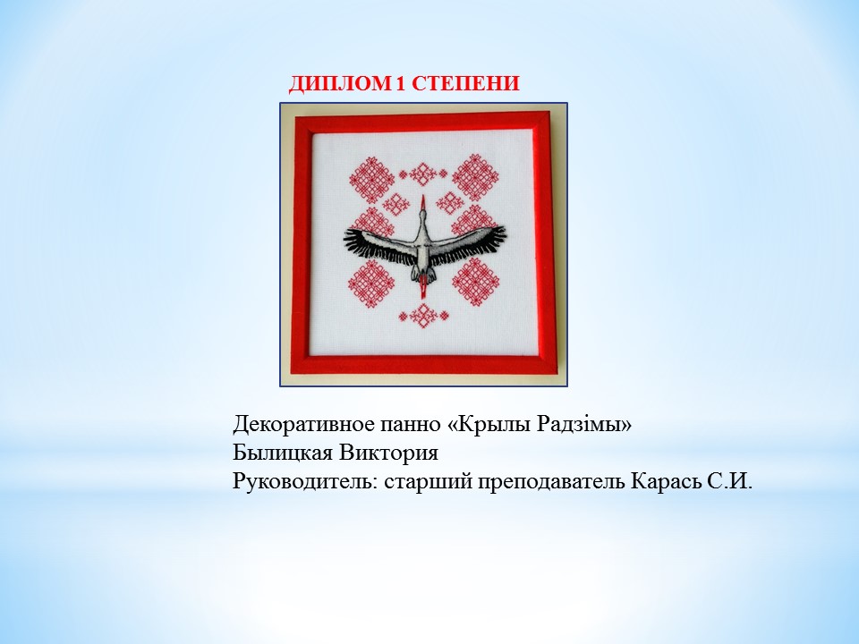 Былицкая Виктория (3 курс) за декоративное панно «Крылы Радзiмы» (руководитель Карась С.И.);