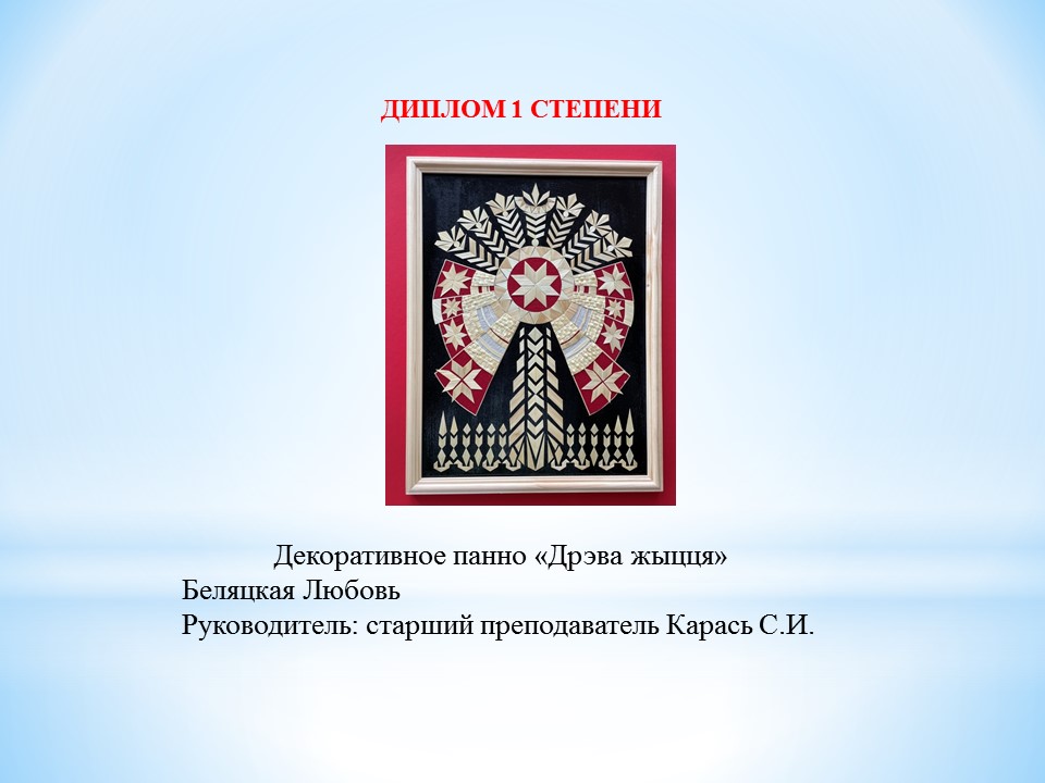 Беляцкая Любовь (5 курс) за декоративное панно «Дрэва жыцця» (руководитель Карась С.И.).