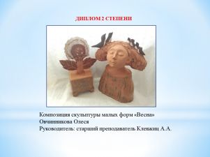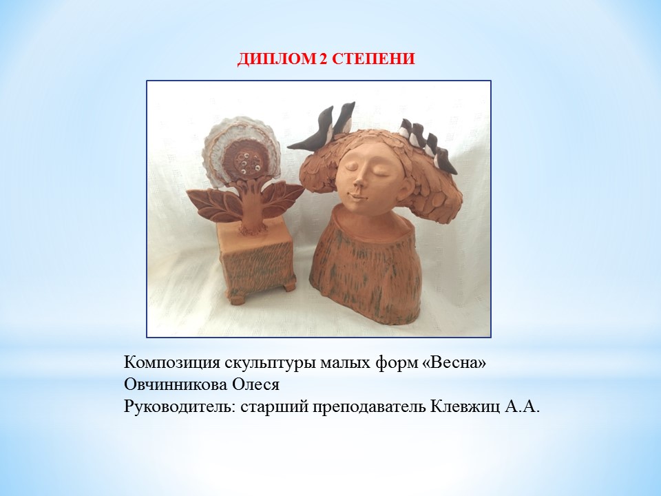 В номинации «Фантазіі палёт і рук тварэння» победителем стала Овчинникова Олеся (4 курс) за декоративное панно «Танец журавлей» (руководитель Карась С.И.) и композицию скульптуры малых форм «Весна» (руководитель Клевжиц А.А.).
