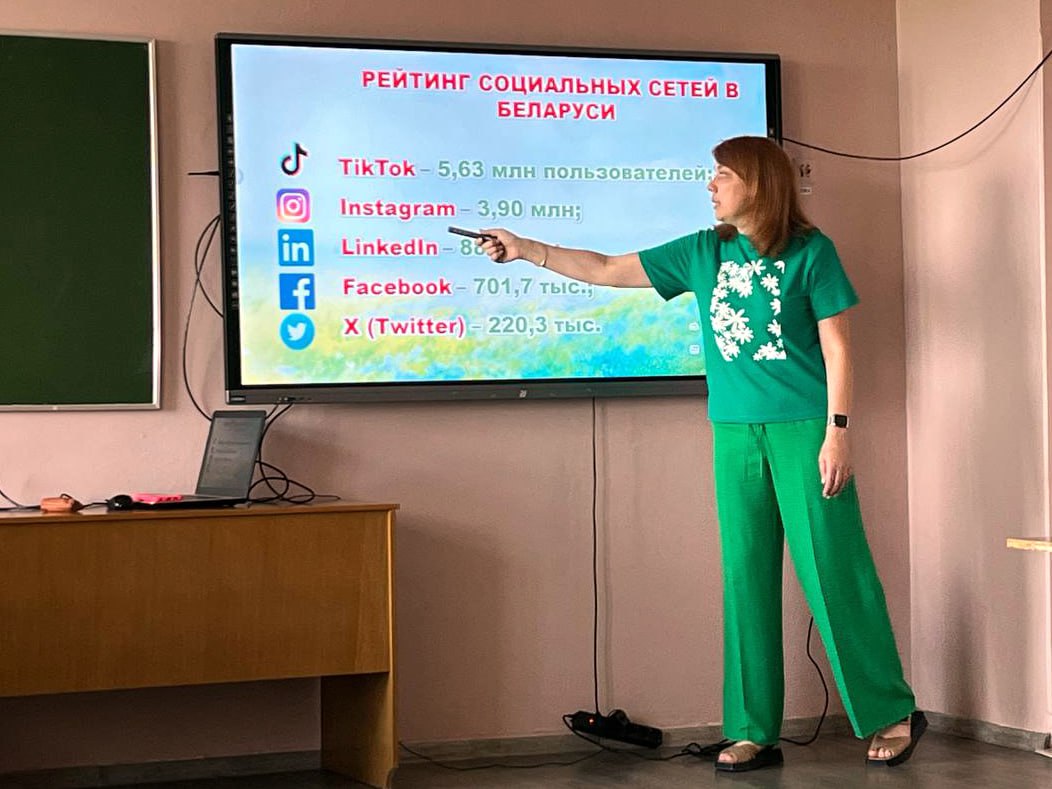 Доцент кафедры теоретической физики и прикладной информатики В.В. Давыдовская рассказала о белорусском медиапространстве, привела статистику по использованию цифровых ресурсов в Беларуси за 2024 год, поделилась сведениями о мероприятиях, связанных с информационными и цифровыми технологиями, проводимыми в Беларуси.