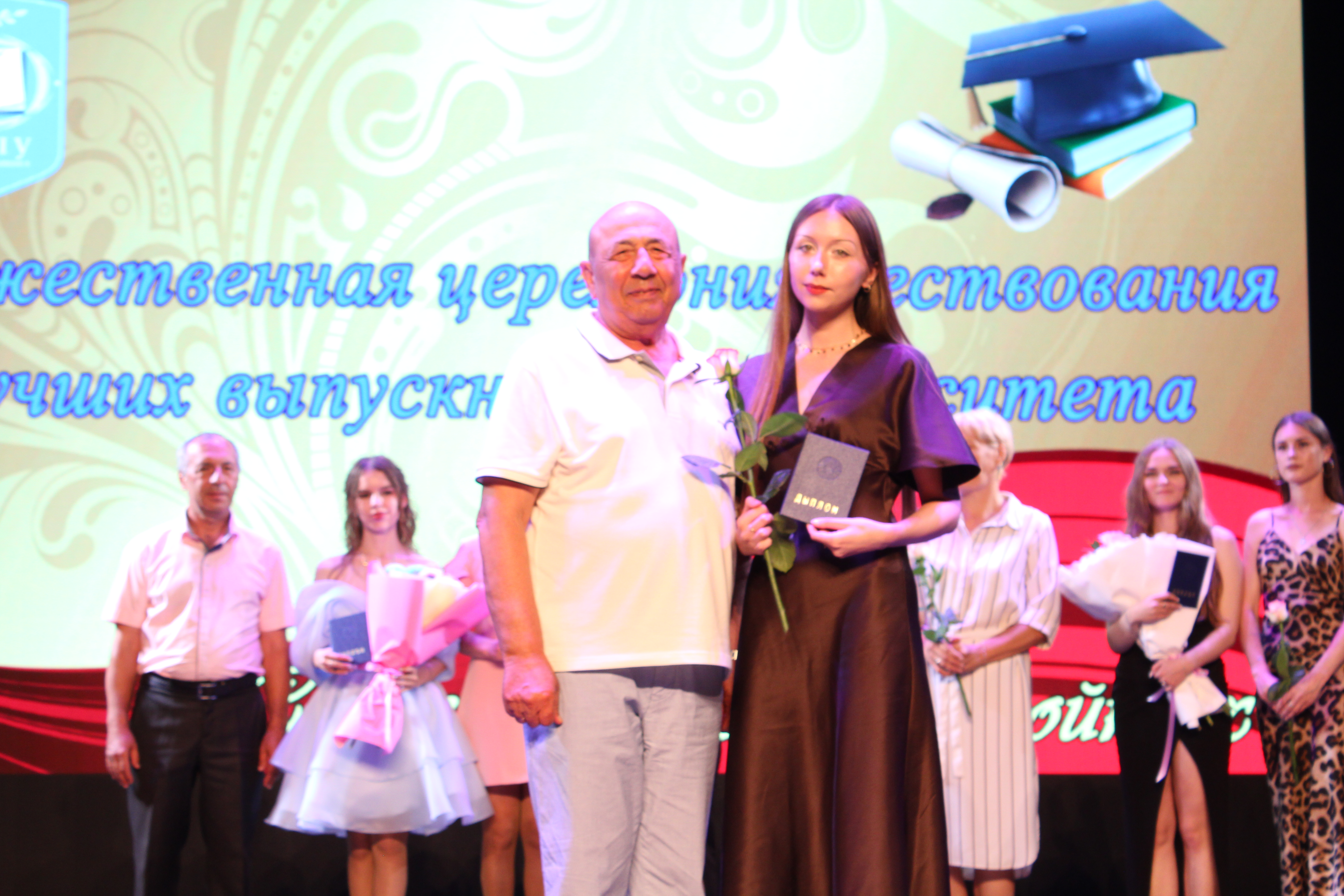 Напутственные слова в адрес выпускников прозвучали от ректора университета Валерия Николаевича Навныко. Ректор пожелал выпускникам 2024 года успехов во всех делах и начинаниях, продолжать развиваться и совершенствоваться на своих первых рабочих местах, всегда оставаться собой, сохранять в душе теплоту и искрометность, а также вручил дипломы с отличием. Всего в этом году было вручено 43 диплома с отличием.