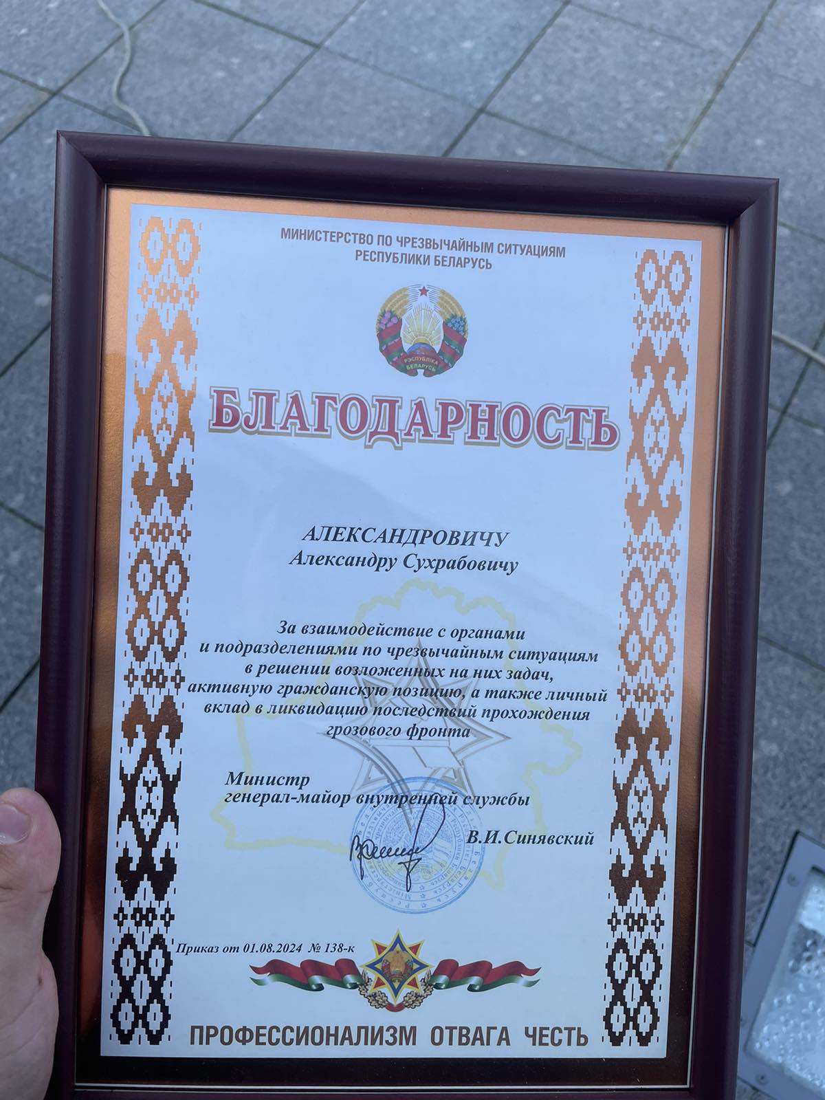 Он получил благодарность от Министра по чрезвычайным ситуациям Республики Беларусь за взаимодействие с органами и подразделениями по чрезвычайным ситуациям в решении возложенных на них задач, активную гражданскую позицию, а также личный вклад в трудный для республики период.