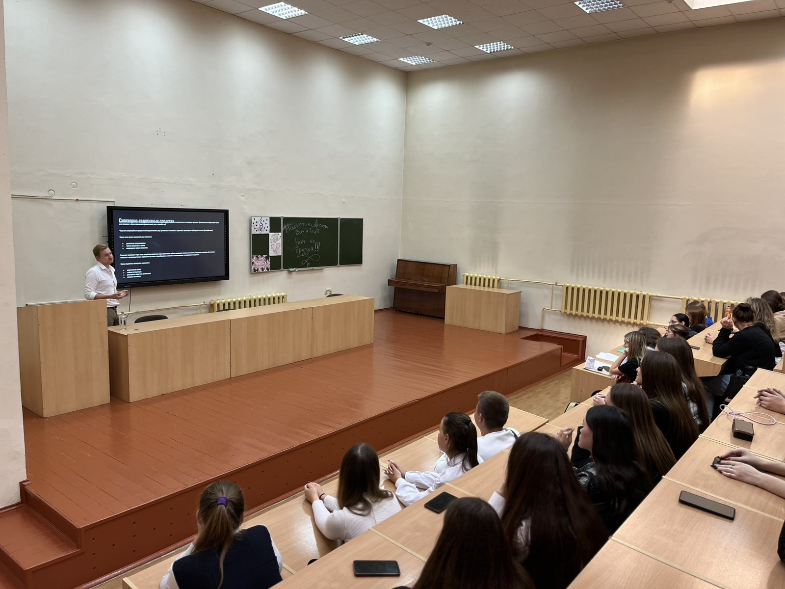 Интерес у аудитории вызвала часть выступления, посвящённая табакокурению и алкоголизму, вред которых общеизвестен и нагляден. Психиатром-наркологом было отмечено, что при систематическом употреблении человеком алкоголя происходят масштабные внутренние изменения – это касается не только психологического аспекта, но и физиологии.