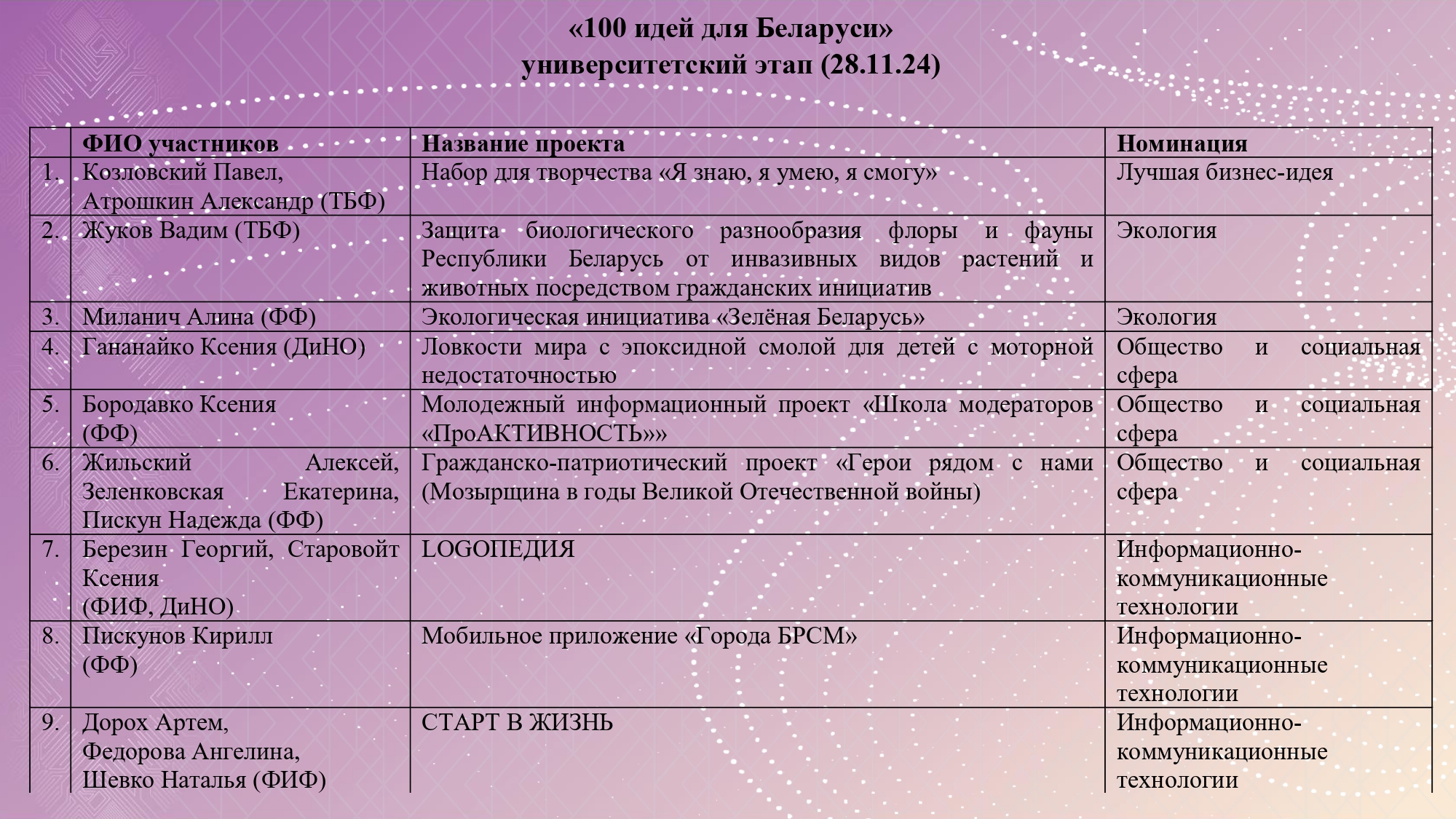 Оценив актуальность, практическую значимость проектов, их реализуемость, чёткость и логическую обоснованность в постановке целей, задач, новизну идей, жюри приняло решение рекомендовать для дальнейшего участия 3 проекта. Честь представлять наш университет в межвузовском этапе в Гомеле выпала студентам технолого-биологического факультета Козловскому Павлу,Атрошкину Александру, представивших аудитории уникальный набор для творчества «Я знаю, я умею, я смогу», Жукову Вадиму, продвигающему экологический проект «Защита биологического разнообразия флоры и фауны Республики Беларусь от инвазивных видов растений и животных посредством гражданских инициатив», и студенту филологического факультета Пискунову Кириллу, разработавшему новое мобильное приложение «Города БРСМ».