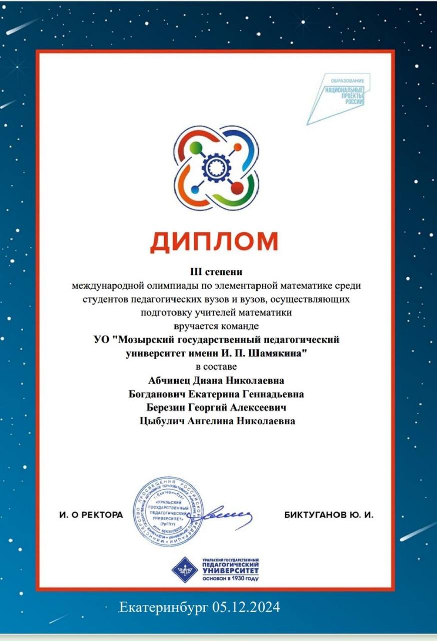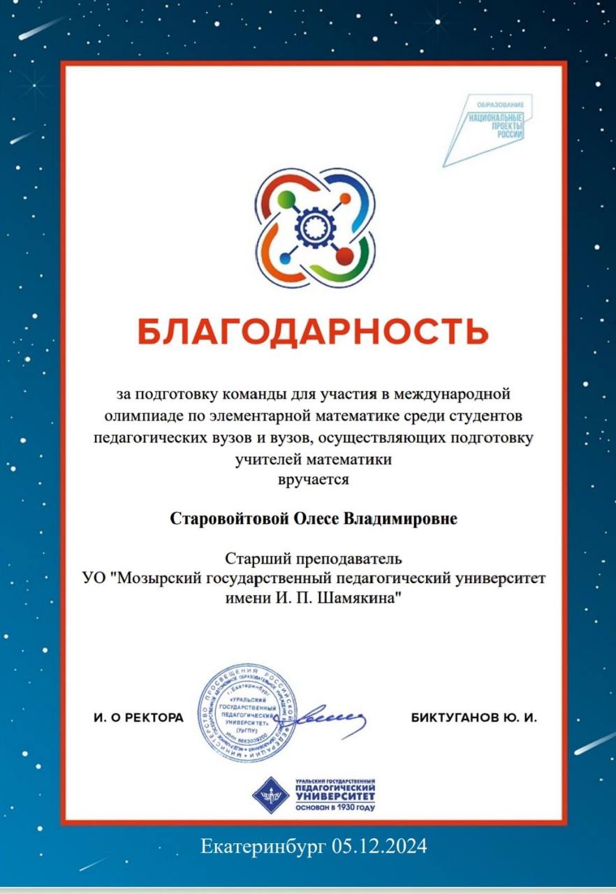 Подготовкой студентов к олимпиаде по математике занималась Старовойтова Олеся Владимировна, старший преподаватель кафедры теоретической физики и прикладной информатики. Руководитель команды была отмечена благодарностью от ректора ФГБОУ ВО «Уральский государственный педагогический университет».