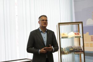 Почетным гостем университета в этот день стал генеральный директор Национальной библиотеки Беларуси Вадим Францевич Гигин, который не просто презентовал выставку, но и рассказал о значимости каждой книги в контексте культурных и политических взаимоотношений нашей страны с другими государствами.